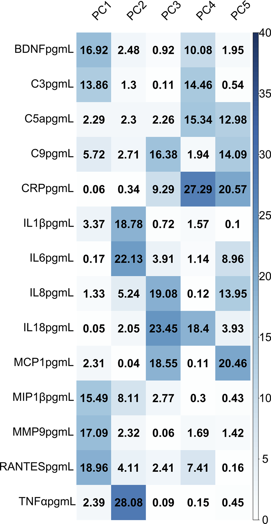 Heatmap demonstrating the percentage contribution of each analyte to variability in the cord blood profile, grouped by principal component.