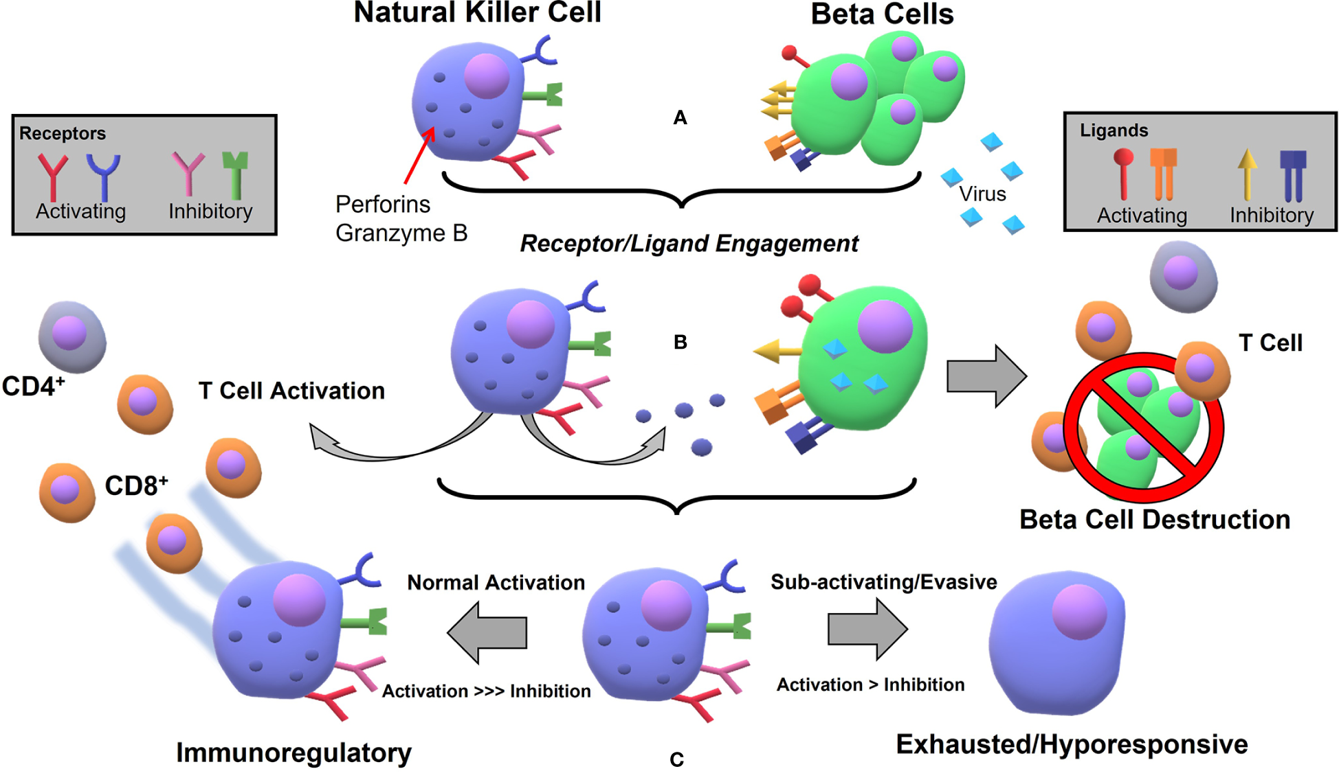 The development of autoimmune diabetes is generally thought to progress as follows. A susceptible person has at most minor abnormalities in the number and phenotype of immune cells such as NKs as a result of genetic and/or environmental factors (e.g. microbiome activity, endogenous virus, epigenetic regulation). An external stimulus – most likely viral infection – is key in precipitating a peripheral immune reaction that leads to formation of autoreactive T cells and antibodies that ultimately leads to the destruction of the functional pancreatic islet cells and necessitation of insulin dependence. NKs are involved at an early stage, where external stimulus takes place and peripheral tolerance breaks down. The receptors as well as their ligands that are involved in NK activation are both aberrantly activated, and β cell attack becomes inevitable. It should be emphasized that this represents the collapse of a very fragile balance, where the combination of several small factors exponentially precipitates into a catastrophic event. The existence and rarity of late-onset autoimmune diabetes exemplifies this fact, as avoiding the confluence of these small events late into adulthood is highly unlikely.