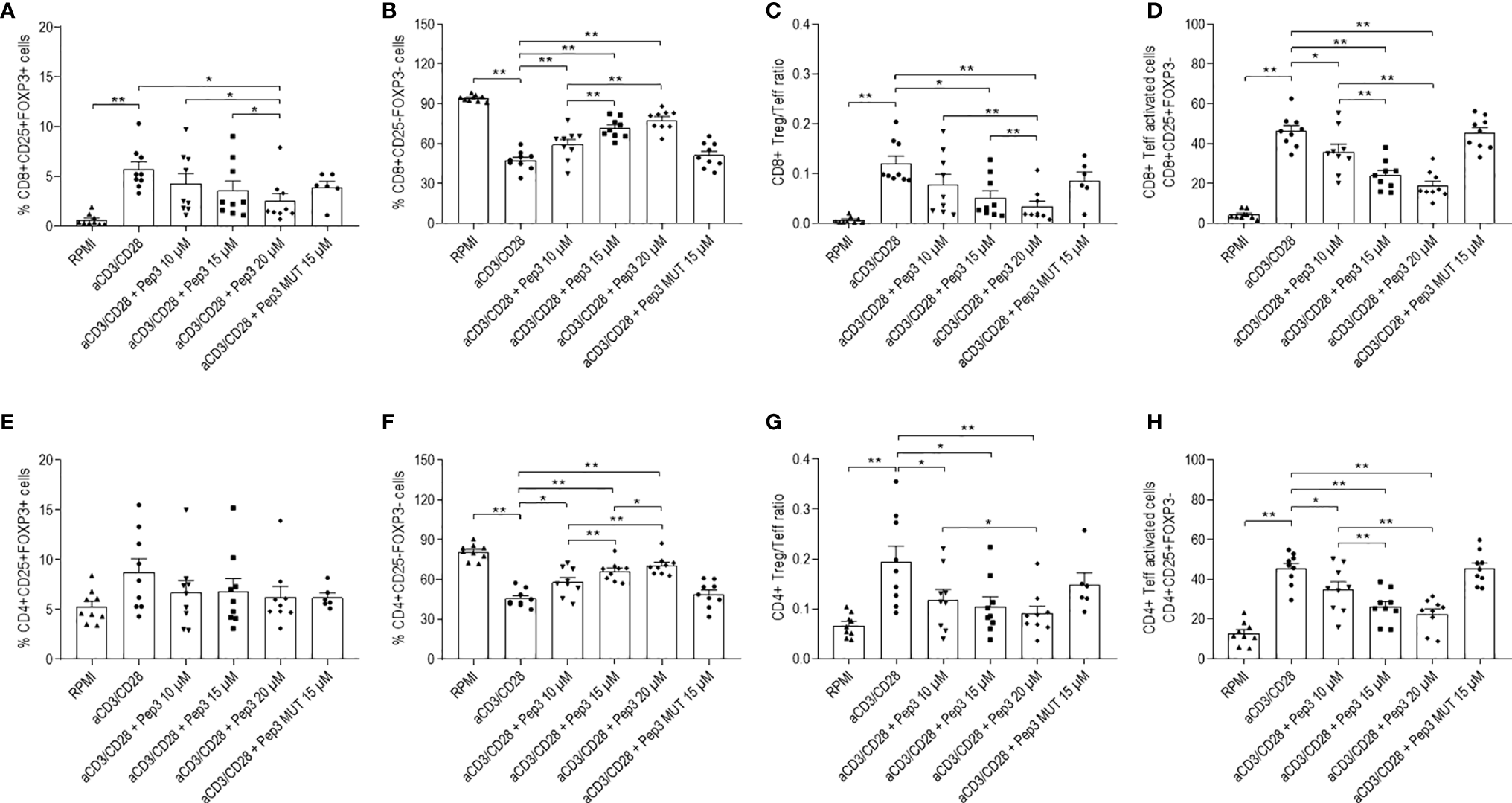 Frequency of T-cell populations in PBMC isolated from TC patients treated with peptide 3 and subsequently stimulated with anti-CD3/CD28 beads for 4 days. Flow-cytometry analysis of TC PBMC untreated unstimulated (RPMI) or stimulated (anti-CD3/CD28), treated with 10, 15, and 20 µM Pep3 or 15 µM of Pep3 MUT and subsequently stimulated with anti-CD3/CD28 beads for 4 days. Percentages of CD8+ subsets (CD8+ Treg, CD8+ Teff, CD8+ Teff activated) were calculated on total CD8+ cells. Percentages of CD4+ subsets (CD4+ Treg, CD4+ Teff, CD4+ Teff activated) were calculated on total CD4+ cells. Percentages of total CD8+ and CD4+ cells were calculated on total lymphocytes. Graphs show the percentages upon CD3/CD28 stimulation of CD8+ Treg as CD8+CD25+FOXP3+ cells (A), CD8+ Teff as CD8+CD25−FOXP3− cells (B), CD8+ Treg/Teff ratio (C), CD8+ Teff activated cells as CD8+CD25+FOXP3− cells (D), CD4+ Treg as CD4+CD25+FOXP3+ cells (E), CD4+ Teff as CD4+CD25−FOXP3− cells (F) (please refer for gating strategy to S1 Figure), CD4+ Treg/Teff ratio (G), percentage of CD4+ Teff activated cells as CD4+CD25+FOXP3− cells (H). Statistical significance was evaluated using Wilcoxon matched-pairs signed rank test. Data are expressed as mean ± SEM, and each dot corresponds to an individual TC patient (n = 10). *p < 0.05, **p < 0.01.