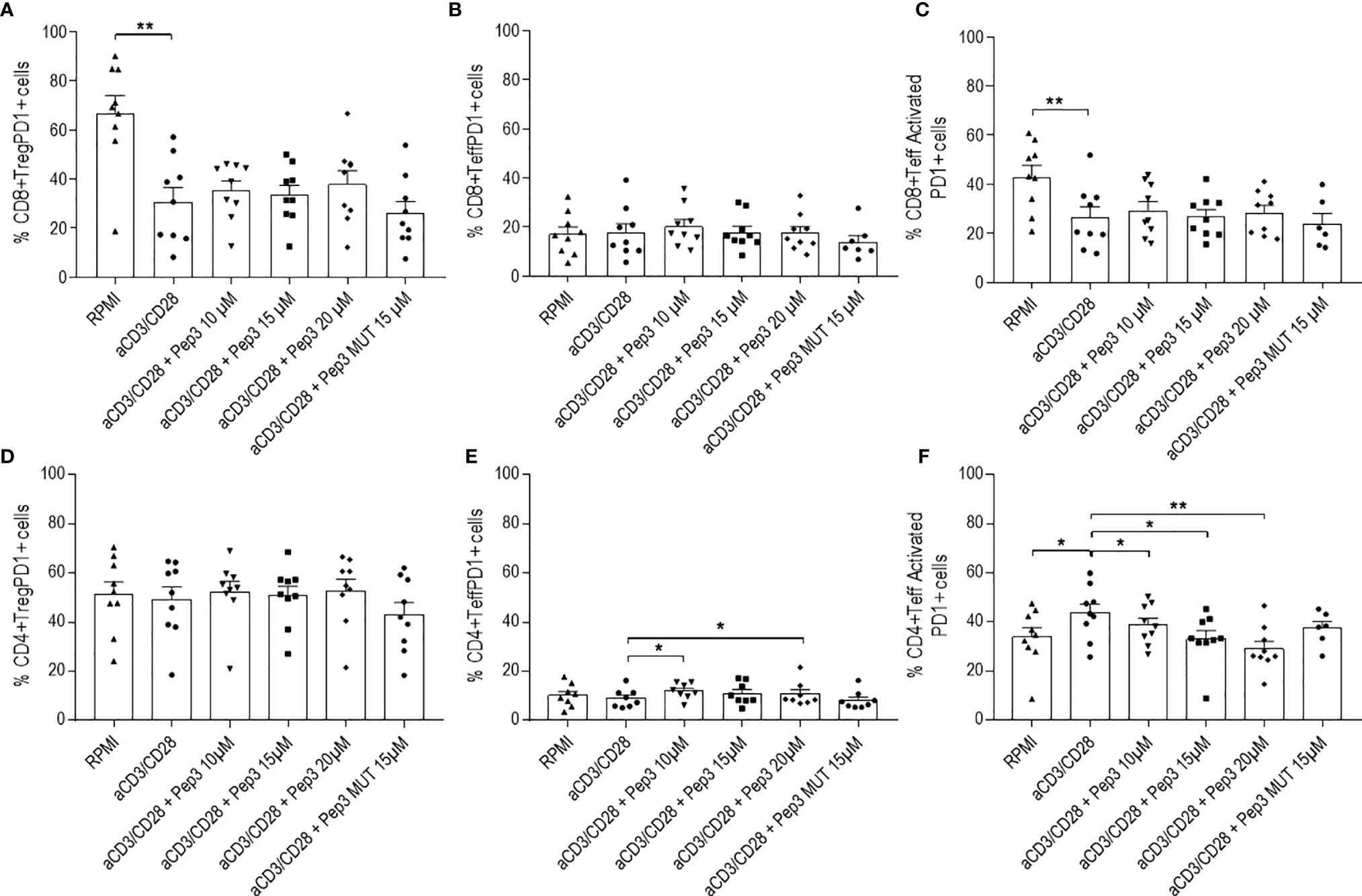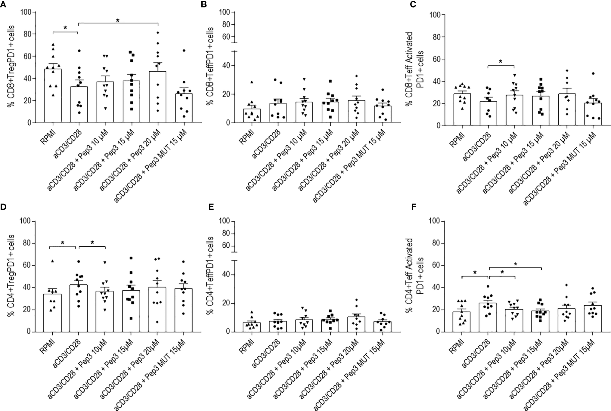 With the purpose of investigating T cell activation following Pep3 reactivation, expression of the regulatory PD1 molecule was studied after 24 h of Pep3 treatment and subsequent anti-CD3/CD28 stimulation (Figure 3A–F, 4A–F).