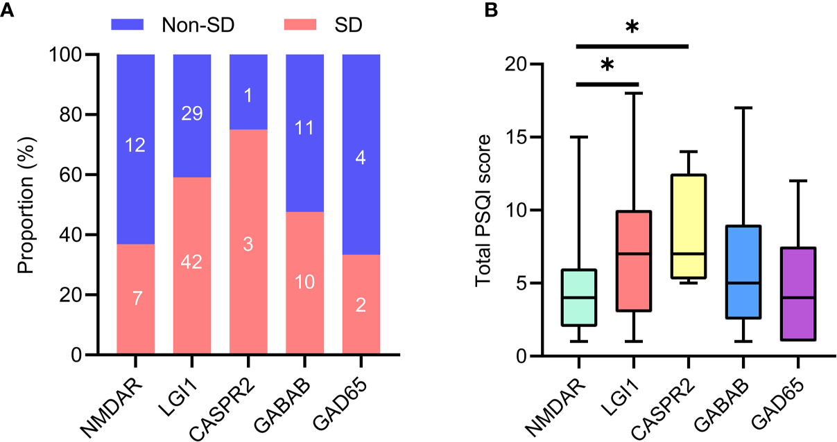 Sleep disorders in specific antibody subtypes of AE. (A) Number of patients with sleep disorders in subtypes of AE. (B) Comparison of total PSQI score was made among subtypes of AE. AE, autoimmune encephalitis; PSQI, Pittsburgh sleep quality index. *P <0.05.
