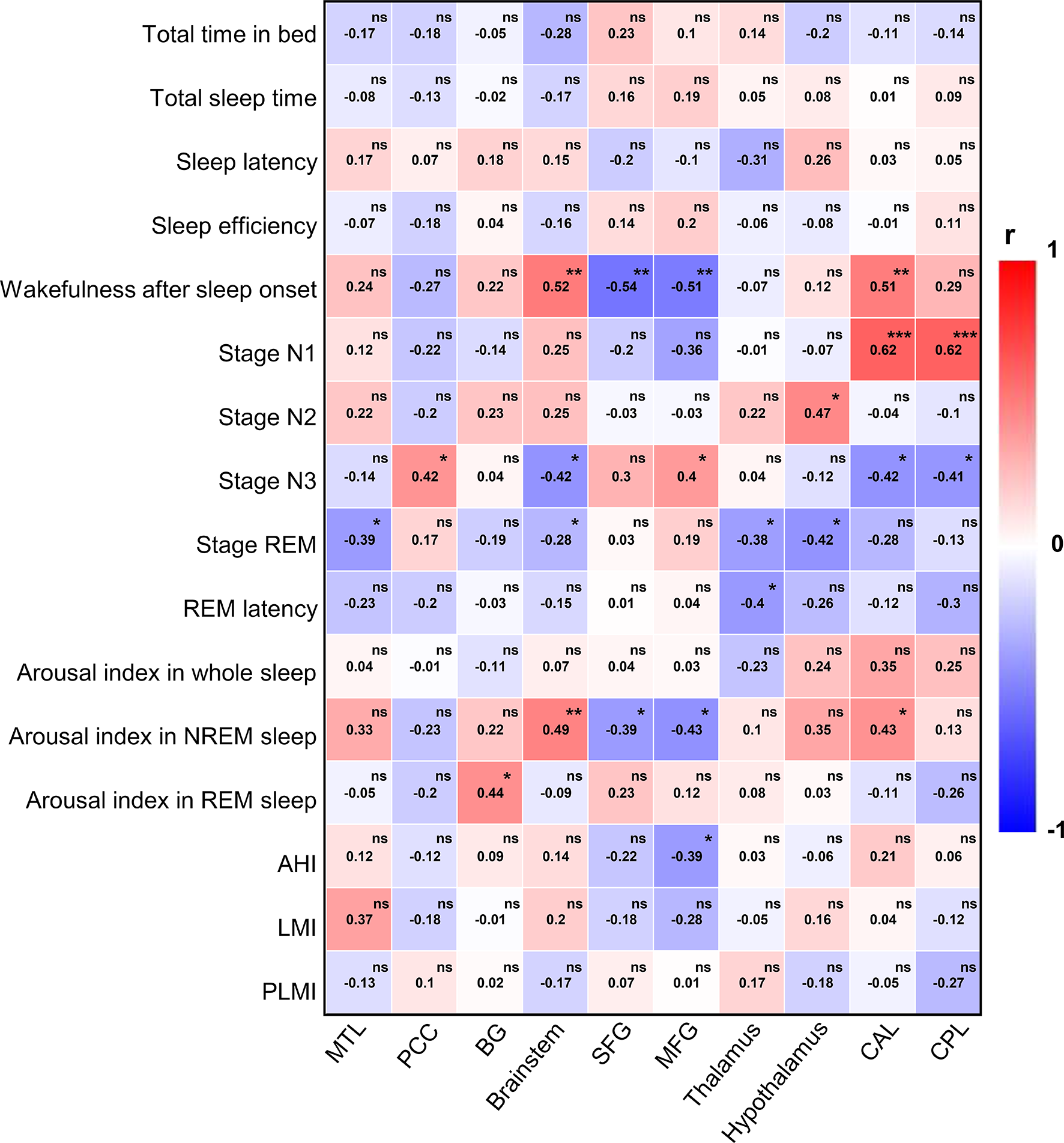 Clinical variables were comprehensively collected for possible inclusion into the risk model. We used binary logistic regression to assess independent risk factors associated with AE with SD; all variables with p < 0.2 in the univariate analysis were included in multivariable logistic regression model. Subsequently, the likelihood ratio test was used in a backwards elimination process (p < 0.05 to retain, p > 0.1 to remove) to select the final set of independent risk factors for retention into the model. Odds ratio (OR) with 95% CI was presented for logistic regression model. The correlation between the SUVR values of selected ROIs and PSG parameters was conducted using Spearman test. A two-sided p < 0.05 was considered to indicate statistical significance. SPSS 22.0 software package (IBM Corp., Armonk, New York, USA) and Prism 8 (GraphPad Software, CA, USA) were used for statistical analyses.