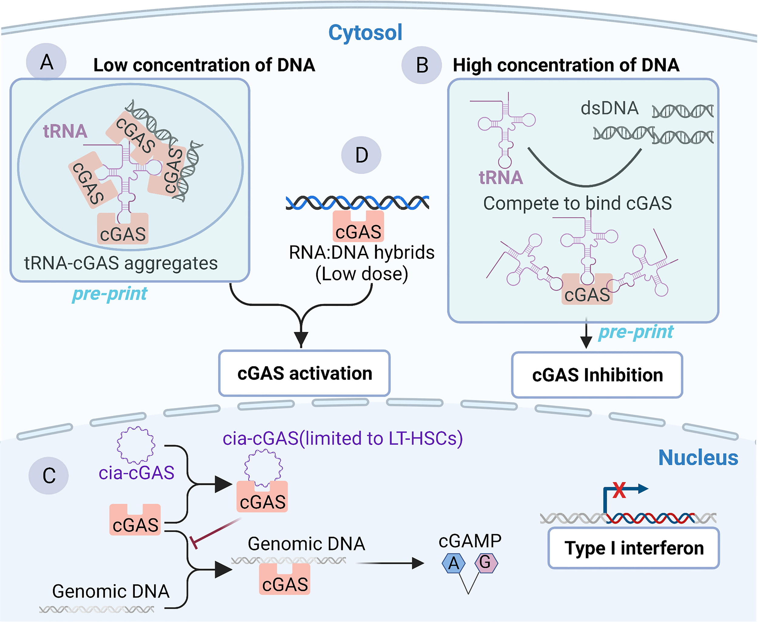 Binding of cGAS to RNA or RNA: DNA hybrids. (A, B) Binding of cGAS to tRNA as reported by a preprint server, which remains to be fully supported experimentally in cells. Cytoplasmic tRNA regulates cGAS activity by interfering with the formation of cGAS-containing aggregates. (A) In the context of low concentrations of DNA, cytoplasmic tRNA forms aggregates with cGAS, providing a platform for dsDNA-mediated cGAS activation. (B) In the context of a high concentration of DNA in the cytoplasm, DNA is sufficient to induce phase separation and activate cGAS. However, tRNA harbors a higher affinity than dsDNA for cGAS. Consequently, cGAS competes with dsDNA to bind cGAS and inhibit cGAS activity to avoid an excessive immune response. (C) Binding of cGAS to cia-cGAS. A circular RNA named cia-cGAS was highly expressed in the nucleus of LT-HSCs. Under homeostatic conditions, cia-cGAS binds cGAS in the nucleus to inhibit its binding to genomic DNA. As a consequence, cia-cGAS suppressed cGAS-mediated production of type I IFNs, thereby protecting dormant LT-HSCs from cGAS-mediated exhaustion. (D) RNA : DNA hybridization products can bind and activate cGAS.