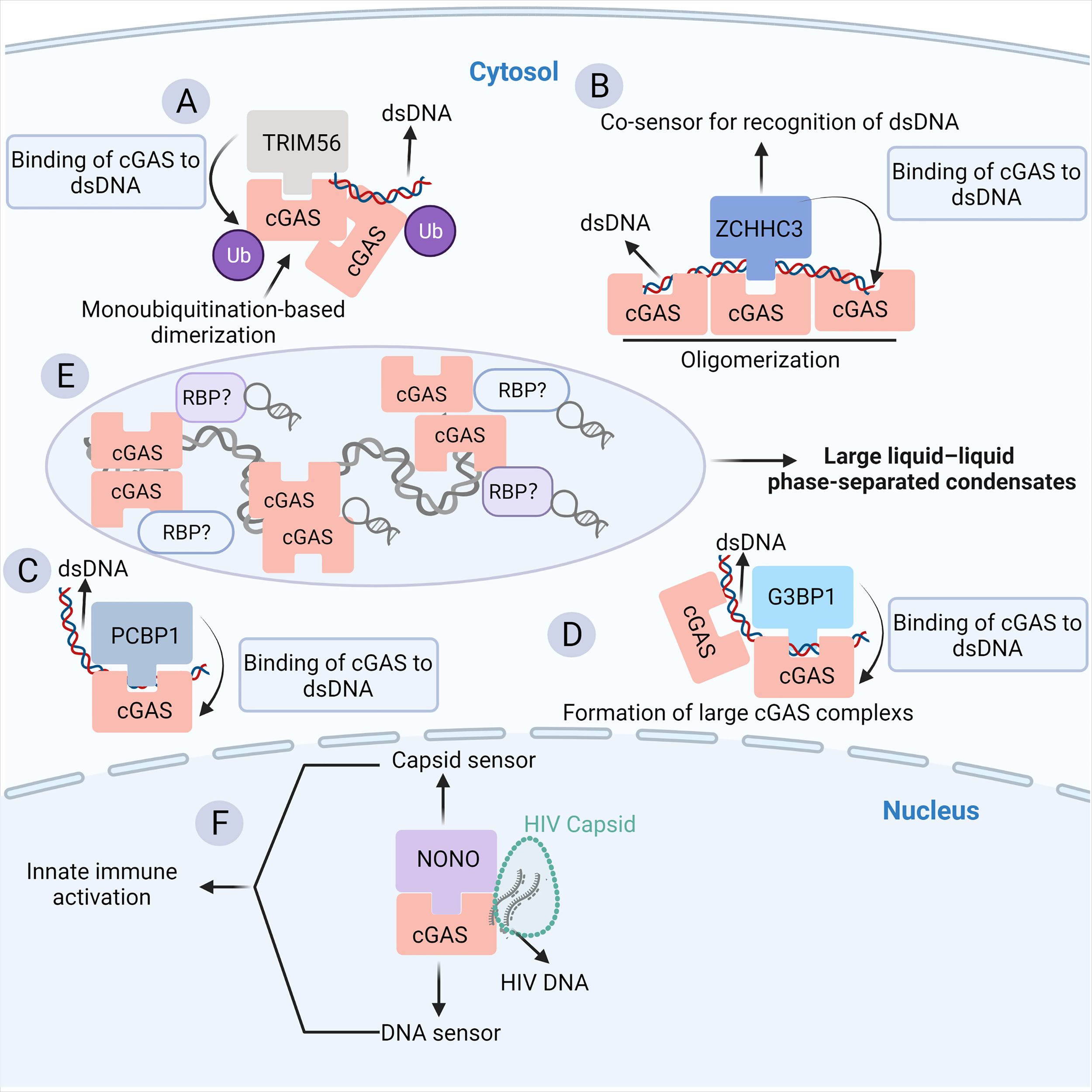 The RBP partners of cGAS. (A) The binding of TRIM56 to cGAS induces the Lys335 monoubiquitylation of cGAS, thereby increasing the dimerization and DNA-binding activity of cGAS. (B) ZCCHC3 acts as a co-sensor for the recognition of dsDNA by cGAS. Briefly, ZCCHC3 binds to dsDNA and interacts with cGAS in the cytoplasm, enhancing the binding of cGAS to dsDNA and the formation of a large cGAS complex. (C) PCBP1 is a critical regulator of DNA recognition by cGAS. PCBP1 was recruited to cGAS in a viral infection-dependent manner. PCBP1 bound to DNA and enhanced cGAS binding to dsDNA. (D) G3BP1 physically interacts with and primes cGAS for efficient activation. G3BP1 enhanced the DNA binding of cGAS by promoting the formation of large cGAS complexes. (E) The binding of cytosolic dsDNA to cGAS induces a robust phase transition to liquid-like droplets, which are considered as microreactors with concentrated RNA and RBPs, suggesting a potential link between cGAS and RBPs. (F) NONO is an essential sensor of the HIV capsid in the nucleus. NONO forms a complex with cGAS in the nucleus. Detection of the nuclear viral capsid by NONO promotes the recognition of DNA by cGAS.