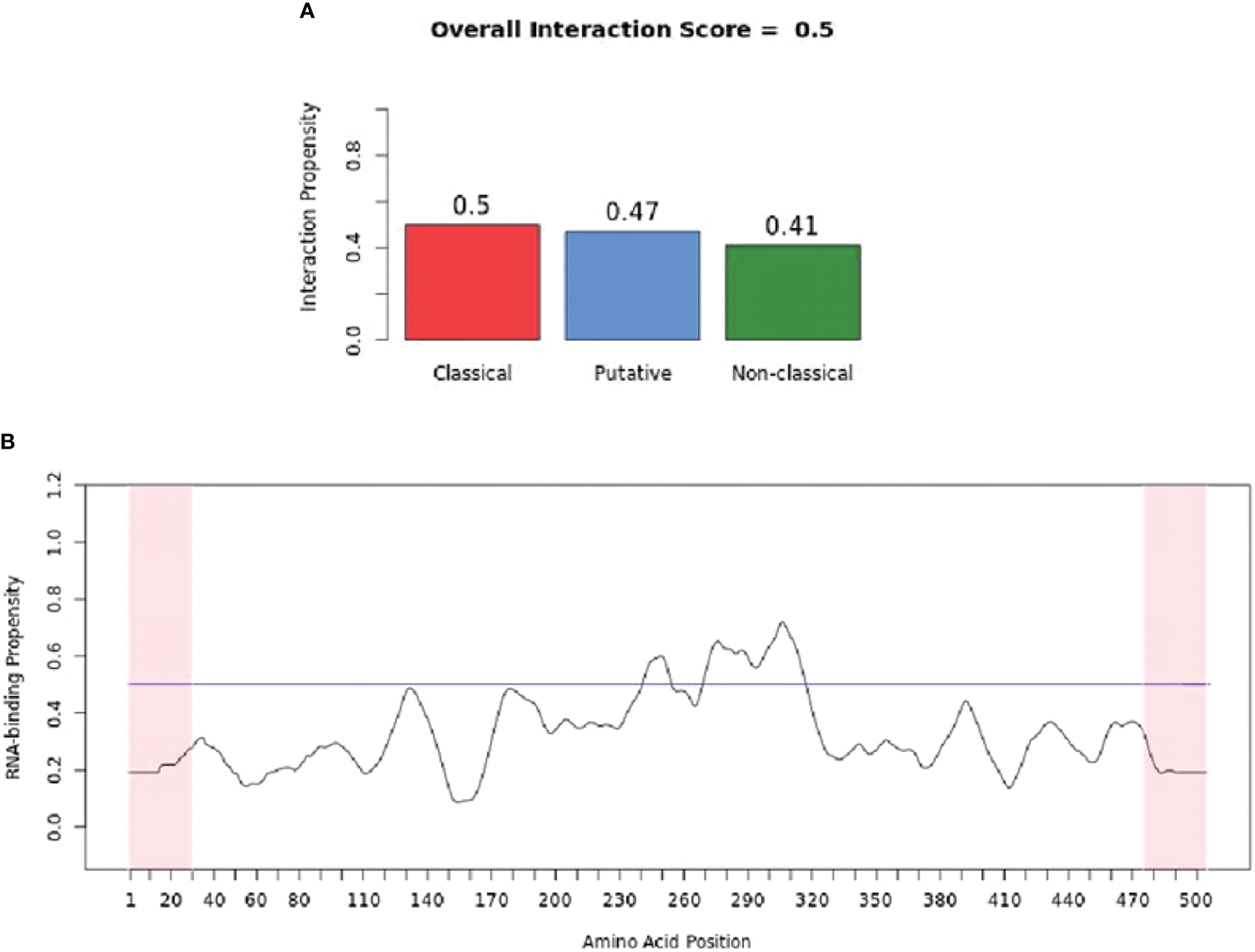 RNA-binding ability of murine-cGAS determined by catRAPID signature. (A) The propensity of murine cGAS for classical (0.5), putative (0.47), and nonclassical (0.41) RBPs. The overall interaction score (0.5) for murine cGAS as an RBP was also present. (B) The profile shows protein regions and their propensity to interact with RNA. All results were predicted by using catRAPID.