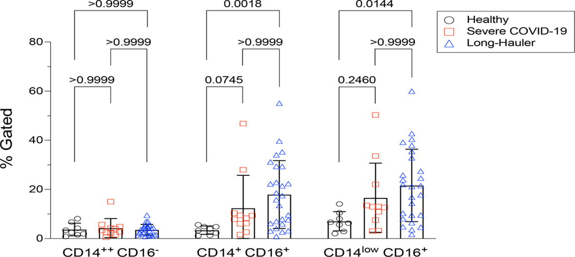 Similar to other inflammatory and infectious conditions such as sepsis, lupus erythematosis, and rheumatoid arthritis among others (9), we detected statistically significant increases (P<0.002) of intermediate CD14+, CD16+ monocytes in individuals with PASC compared to healthy controls. In addition, CD14lo, CD16+ non-classical monocytes were also significantly elevated in PASC (P=0.01). Neither intermediate nor non-classical monocytes were elevated in severe COVID-19 (Figure 1).