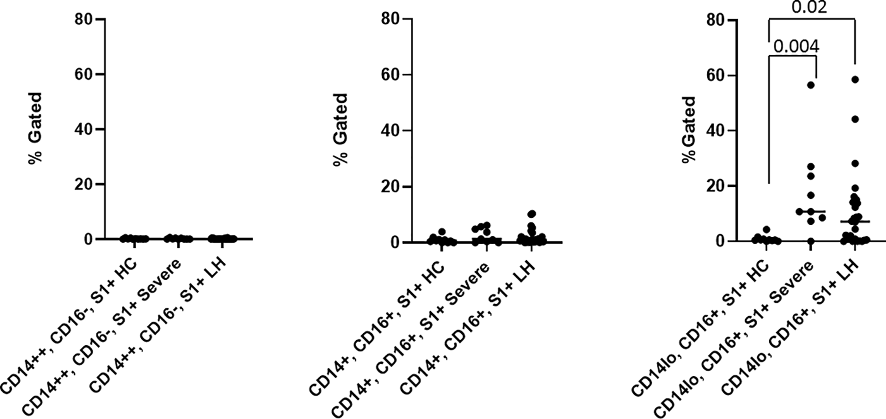 Figure 3 Quantification of SARS-CoV-2 S1 protein in monocyte subsets isolated from healthy 63 controls (HC), severe COVID-19 (severe), and PASC patients (LH). SARS-CoV-2 S1 protein was expressed in non-classical monocytes in both severe and PASC individuals. Values (median value-horizontal line) for each category were based on the parental gating in Supplementary Figure 1. Statistical analysis was performed using the Kluskal-Wallis test. P values <0.05 are considered significant.
