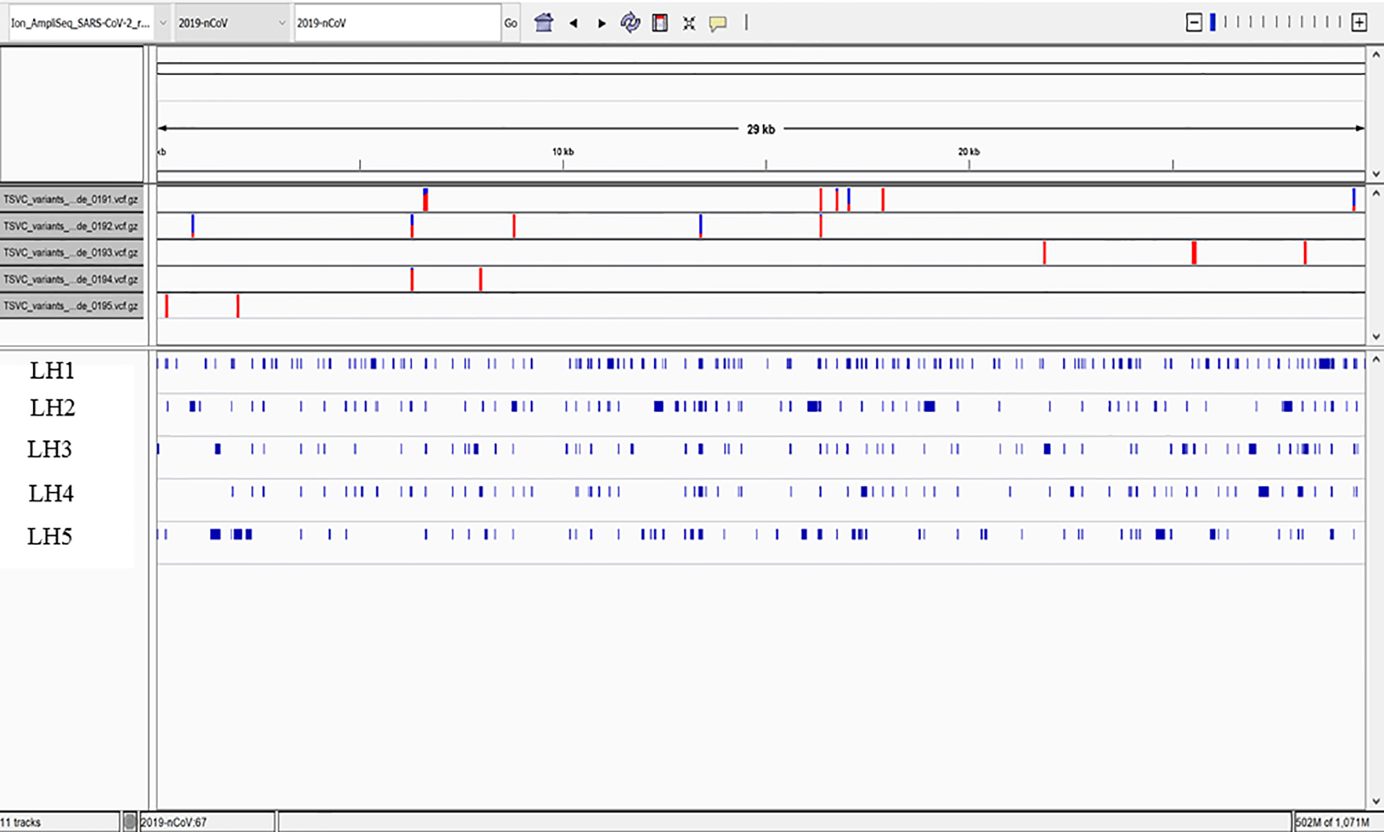 Five RNA samples were subjected to AmpliSeq library preparation using the Ion AmpliSeq Library Kit 2.0 (Thermo Fisher Scientific Catalog no. 4480441) and the Thermo Fisher Scientific Insight panel, which consists of 238 amplicons in a two pool design against SARS-CoV-2 and seven amplicons as human controls. Libraries were prepared following manufacturer’s recommendations. Final libraries were amplified using 5 cycles of amplification and libraries were cleaned up using 0.5X right sided cleanup and 1.2X left sided cleanup using Kapa Pure Beads (Roche Catalog no l7983298001). Final libraries were quantified using Ion Library TaqMan Quantitation Kit (ThermoFisher Catalog no. 4468802). Samples were pooled in an equimolar distribution and loaded on to the Ion Chef Instrument (ThermoFisher Catalog no. 4484177) for Templating onto a 510 chip. The prepared chip was then loaded onto a GeneStudio S5 Prime (ThermoFisher Catalog no. A38196) for sequencing.