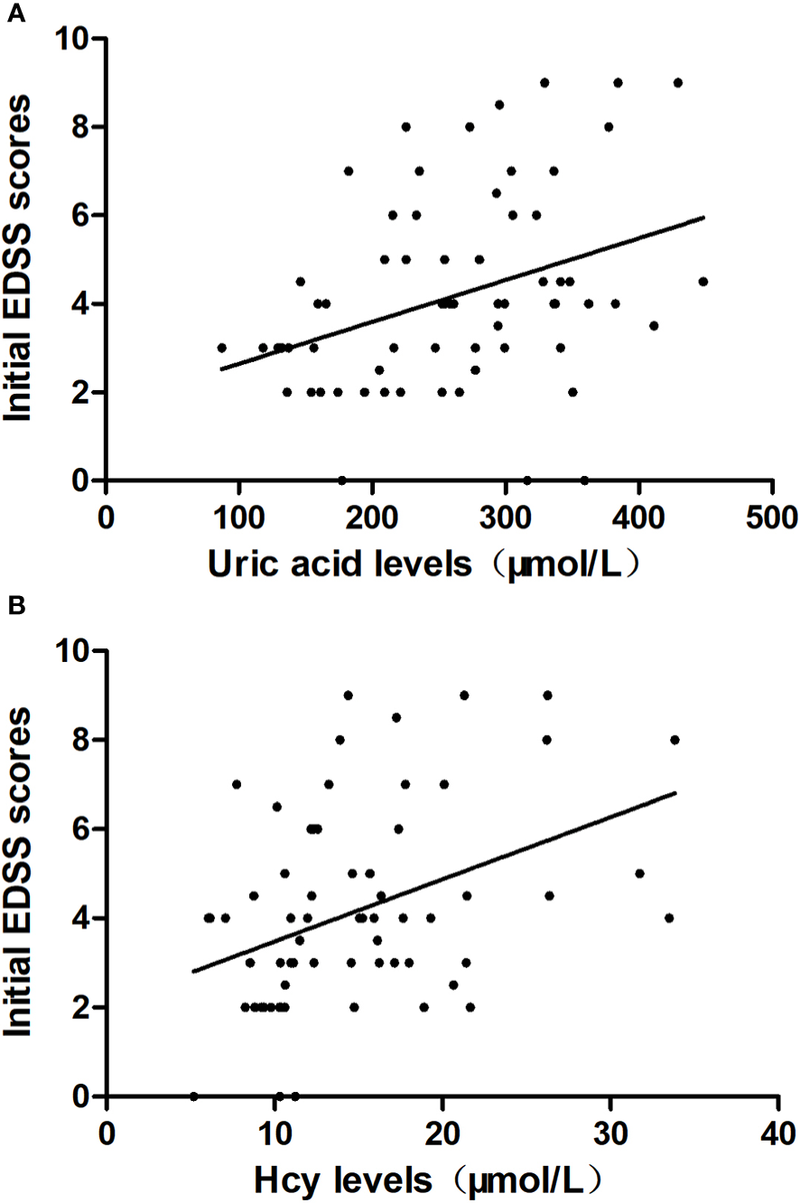 Continuous data with a normal distribution are presented as mean ± standard deviation. Continuous data with a non-normal distribution are presented as median ± interquartile range. Categorical variables are expressed as frequency (percentage, %). The differences between the two groups were analyzed using the Student’s t-test and Wilcoxon test for normally and non-normally distributed data, respectively. Categorical data were compared using the chi-square test when comparing numbers ≥5 or Fisher’s exact test when comparing small numbers <5. A univariate logistic regression analysis was used to identify potential predictive factors for the severity of neurological dysfunction at the onset of MOGAD. A multivariate logistic regression analysis was used to determine the independent predictive factors for the severity of neurological dysfunction at disease onset. Variables with a significance level of P < 0.1 in the univariate logistic regression analysis were included in the basic model. Variables clinically believed to have an impact on the initial EDSS (including age at onset and sex) and factors that affect Hcy levels (including folic acid and vitamin B12) were included in the adjusted model to analyze the stability of the associations between uric acid levels, Hcy levels, and the severity of neurological dysfunction at disease onset. A correlation analysis was performed using the Spearman correlation analysis. Receiver-operating characteristic (ROC) curve analyses were used to evaluate the diagnostic value of the uric acid and Hcy levels for the severity of neurological dysfunction at the onset of MOGAD.