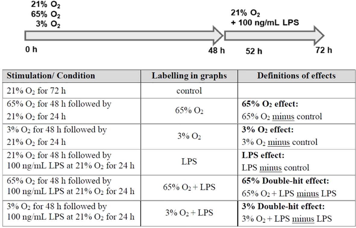 In summary, the cytokine release of preterm MФ after priming with 65% O2 and subsequent LPS stimulation indicated an exaggerated pro-inflammatory profile compared to term and adult MФ whereas priming the preterm MФ with 3% O2 leads to a slight suppression of pro-inflammatory cytokine release.