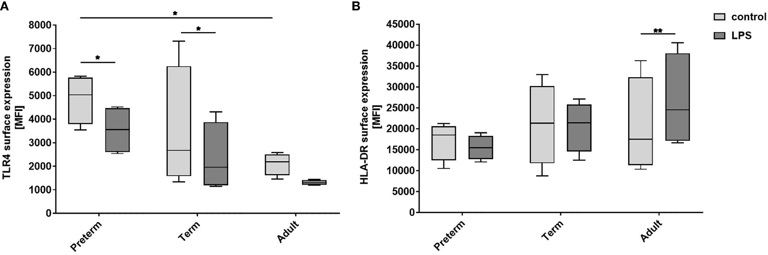 Expression of activation markers on preterm, term, and adult macrophages (MФ) after LPS stimulation. LPS-stimulated MФ of preterm infants compared to term and adult MФ incubated for 72 h (48 h 21% O2 followed by 24 h at 21% O2 with or without LPS). (A) Surface expression of TLR4. (B) Surface expression of HLA-DR. Mean fluorescence intensity [MFI] of surface proteins on macrophages in all three groups assessed by flow cytometry. (n=4 independent experiments with cells of four different donors, box plots: median ± 25th to 75th percentiles and minimum to maximum, ANOVA followed by Holm-Sidak’s test, *p<0.05, and **p<0.01).