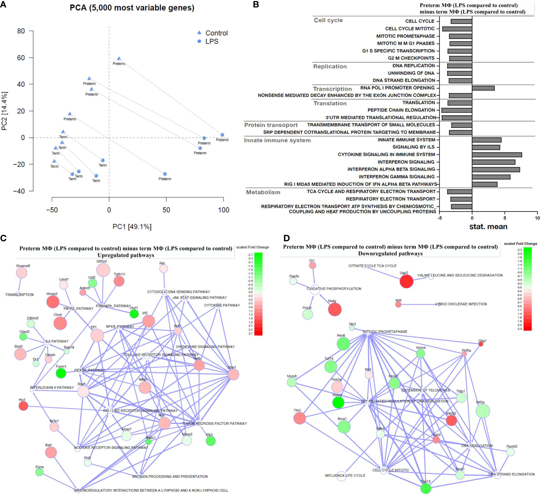 Transcriptome analysis of LPS-stimulated preterm macrophages (MΦ) compared to term MΦ. Preterm and term MФ were incubated for 72 h (48 h 21% O2 followed by 24 h 21% O2 with or without LPS). (A) Principal component analysis (PCA) to show distribution of samples based on the 5000 most variable genes in the RNA samples of MΦ. The PCA plot shows clusters of samples based on their similarity, which revealed clustering of RNA samples from preterm and term MΦ dependent on LPS stimulation (cluster symbols: triangles=control and circles=LPS; paired samples are connected) and gestational age (preterm vs. term labeling). (B–D) The bar graph and the regulator networks combine the effect of gestational age and stimulatory condition by comparing the difference of LPS stimulation with control (21% O2) from preterm MΦ to the same difference from term MΦ. (B) The pathway profile is based on the REACTOME gene sets (provided by MSIGDB library) after input of differentially regulated genes (unpaired t-test, padj < 0.05) from preterm and term MФ. It shows the “mean of gene set”-values which were significantly regulated. The following categories were detected: cell cycle, replication, transcription, translation, protein transport, innate immune system, and metabolism. (“mean of gene set” test statistic, padj < 0.05). (C) Upregulated and (D) downregulated pathways (white) due to significant difference in key transcriptional regulators (green: downregulated transcription factors; red: upregulated transcription factors; TRAP analysis; GAGE cutoff p<0.1; regulator cutoff p<0.01). (A–D): n=4 independent experiments with cells of four different donors (3 out of 4 donors are the same as Figure 2 72 h time point).