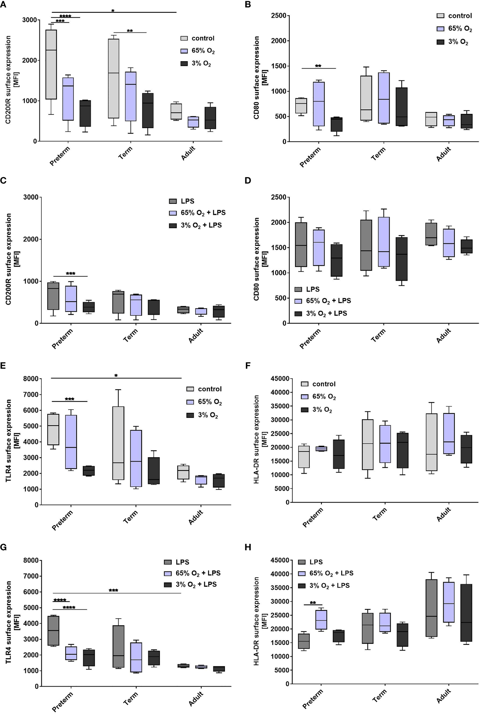 Expression of activation marker on preterm, term, and adult macrophages (MФ) primed with various O2 concentrations followed by LPS. Surface expression of CD200R, CD80, TLR4, and HLA-DR after O2 exposure only compared to control (21% O2) (A, B, E, F) and after priming with 65% O2 or 3% O2 followed by LPS compared to LPS alone (C, D, G, H) incubated for 72 h (48 h 65% O2 or 3% O2 followed by 24 h 21% O2 with or without LPS). Mean fluorescence intensity [MFI] of surface proteins is shown on macrophages in all three groups assessed by flow cytometry. (n=4 independent experiments with cells of four different donors (same donors as Figure 3 ; control and LPS values were re-used from Figure 3 because oxygen and double-hit conditions were included in those experiments), box plots: median ± 25th to 75th percentiles and minimum to maximum, ANOVA followed by Holm-Sidak’s test, *p < 0.05, **p < 0.01, ***p < 0.001, and ****p < 0.0001).