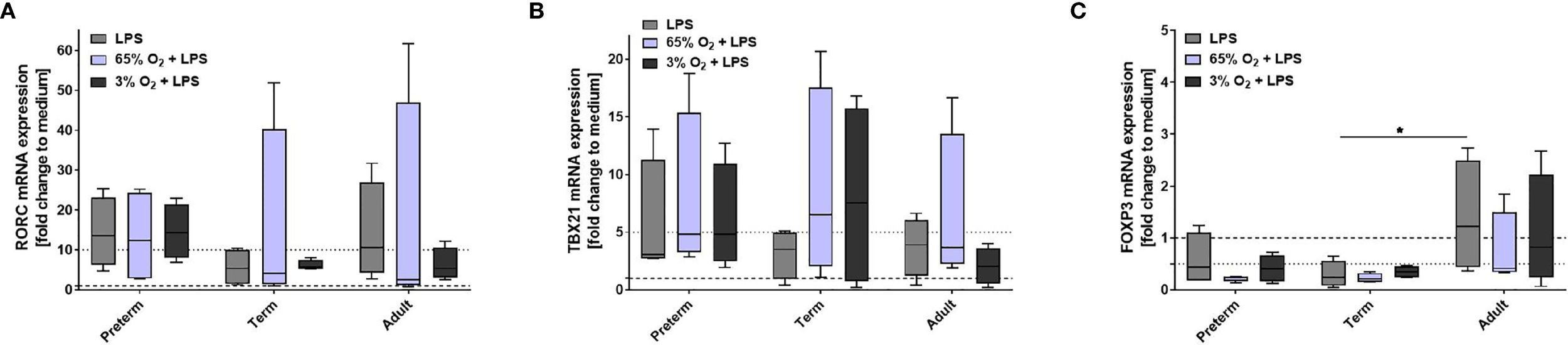 Neonatal CD4+ T cell polarization by supernatants of macrophages (MФ) primed with various O2 concentrations followed by LPS. Neonatal CD4+ T cells were incubated for 6 days with supernatants of preterm, term or adult MФ after priming MФ with 65% O2 or 3% O2 followed by LPS compared to LPS alone. Supernatants were collected after incubation of MФ for 72 h (48 h 65% O2 or 3% O2 followed by 24 h 21% O2 with or without LPS). mRNA was assessed using RT qPCR. Box plots of RORC (A), TBX21 (B) and FOXP3 (C) mRNA expression normalized to β-Actin depicted as a fold change to the medium control. The dotted line at 1 indicates the normalization level and the second dotted line is an auxiliary line for visualization (n=4 independent 72 h supernatants were used (same as Figure 6) on neonatal CD4+ cells isolated from one donor, LPS values were re-used from Figure 4 because double-hit conditions were included in those experiments, box plots: median ± 25th to 75th percentiles and minimum to maximum, ANOVA followed by Holm-Sidak’s test, *p < 0.05).