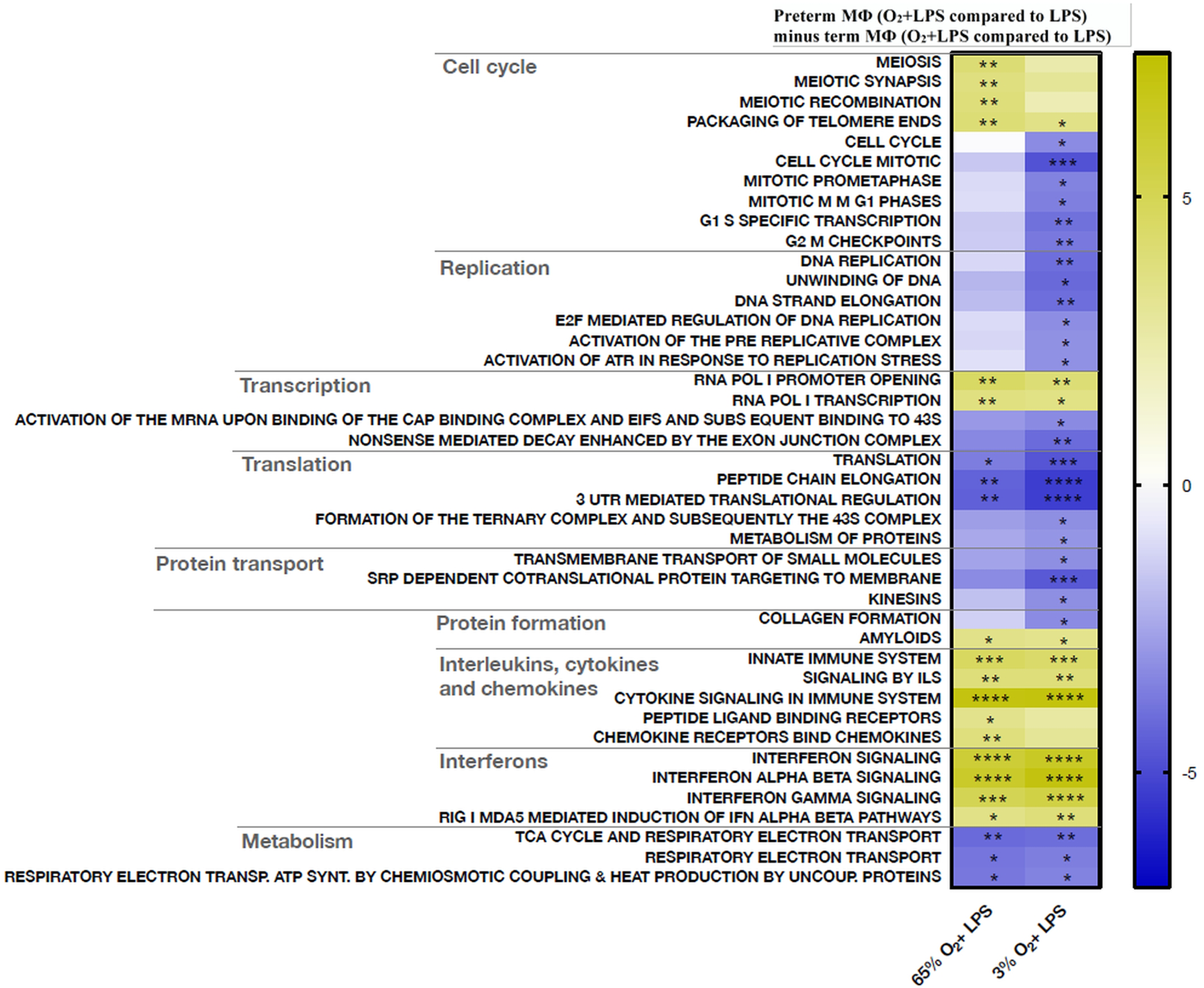 Quality control of RNA-seq reads was visually inspected using FASTQC. Afterwards, reads were pseudoaligned to human cDNA and ncRNA (Ensembl v94, GRCh38) using KALLISTO (v0.43.1) with 30 bootstrap cycles. On average, 90% of reads (equivalent to 33 million reads) were mapped per sample. Quantification files were imported to the R package and gene expression analyses were performed using DESeq2 (v1.30.0). Within the preterm and term group, pairwise comparisons were performed to determine the LPS effects [LPS stimulated cells to 21% O2 (control)], the oxygen effects [65% O2 and 3% O2 stimulated cells to 21% O2 (control)], and the double-hit effects (65% O2 + LPS and 3% O2 + LPS stimulated cells to LPS). Significantly different expressed genes were selected (padj < 0.05, unpaired t-test). To analyze the preterm effects in the above mentioned pairwise comparisons, the term effects were subtracted (e.g., preterm LPS effects – term LPS effects). Multi-factorial RNA-seq analysis was performed using DESeq2. Gene set enrichment analysis was performed on log2 fold changes using GAGE (v2.32.0) against REACTOME gene sets (provided by MSIGDB library) for pathway enrichment analysis (padj < 0.05). In addition, enrichment against the MUELLER PLURINET gene set (32) was tested using GAGE. Principal component analysis (PCA) was performed to inspect the distribution of samples using the mapped RNA-seq data and selecting for the 5,000 most variable genes (R function prcomp with scaling). Pathway enrichment results were plotted using the R package REDER (v1.38.0). To identify gene-pathway regulatory relationships, transcriptional regulatory associations in pathways (TRAP) were analyzed following the approached published by Kwong et al., 2012 (33) using significant gene sets (padj < 0.1).