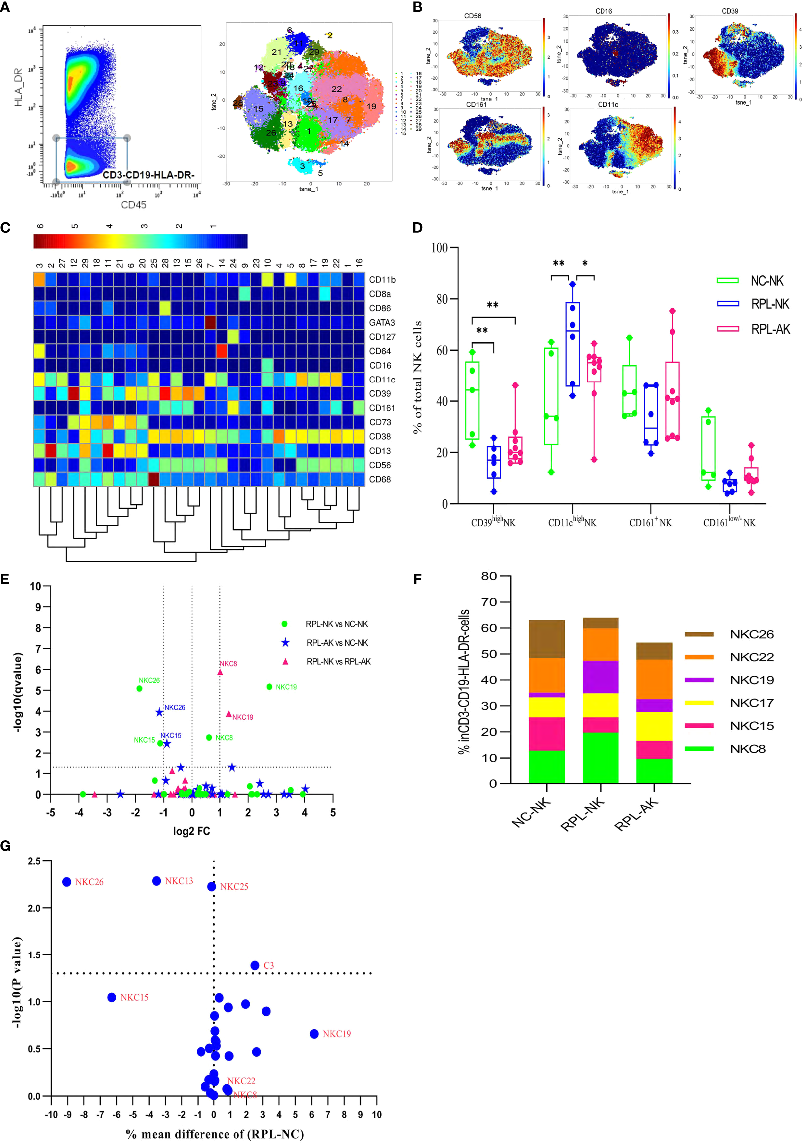 Cluster analysis of ILCs in the CD3−CD19−HLA-DR− population. (A) CD3−CD19−HLA-DR− population was manually gated (left) and tSNE in all samples combined (right). (B) Heatmap showing the expression profile of key markers. (C) Heatmap used for the cluster classification with the expression of markers in the CD45+CD3−CD19−HLA-DR− population. (D) Box plot showing the comparison of CD39high NK cells and CD11chigh NK cells. (E) Volcano plot showing the differential clusters when RPLs were stratified by embryonic chromosome. (F) Map with cumulative mean values for differential clusters and/or the most abundant three clusters. (G) Volcano plot showing the differential clusters when RPLs were not stratified. * adjusted P < 0.05, ** adjusted P < 0.001.