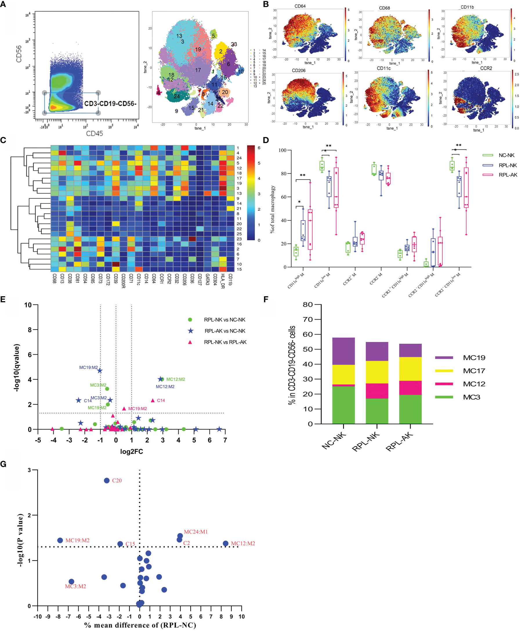 Cluster analysis of myeloid macrophages and DC in the CD3−CD19−CD56− population. (A) Cells manually gated from the CD45+CD3−CD19−CD56− population (left) and tSNE in all samples combined (right). (B) Marker expression profile of the key markers. (C) Heatmap with the expression of markers in the CD45+CD3−CD19−CD56− population. (D) Box plot showing the comparison of total CD11chigh, CD11clow, and/or CCR2−CD11clow when RPLs were stratified. (E) Volcano plot showing the differential clusters when RPLs were stratified by embryonic chromosome. (F) Map with cumulative mean values for differential clusters and/or the most abundant three clusters. (G) Volcano plot showing the differential clusters when RPLs were not stratified. * adjusted P < 0.05, ** adjusted P < 0.001.
