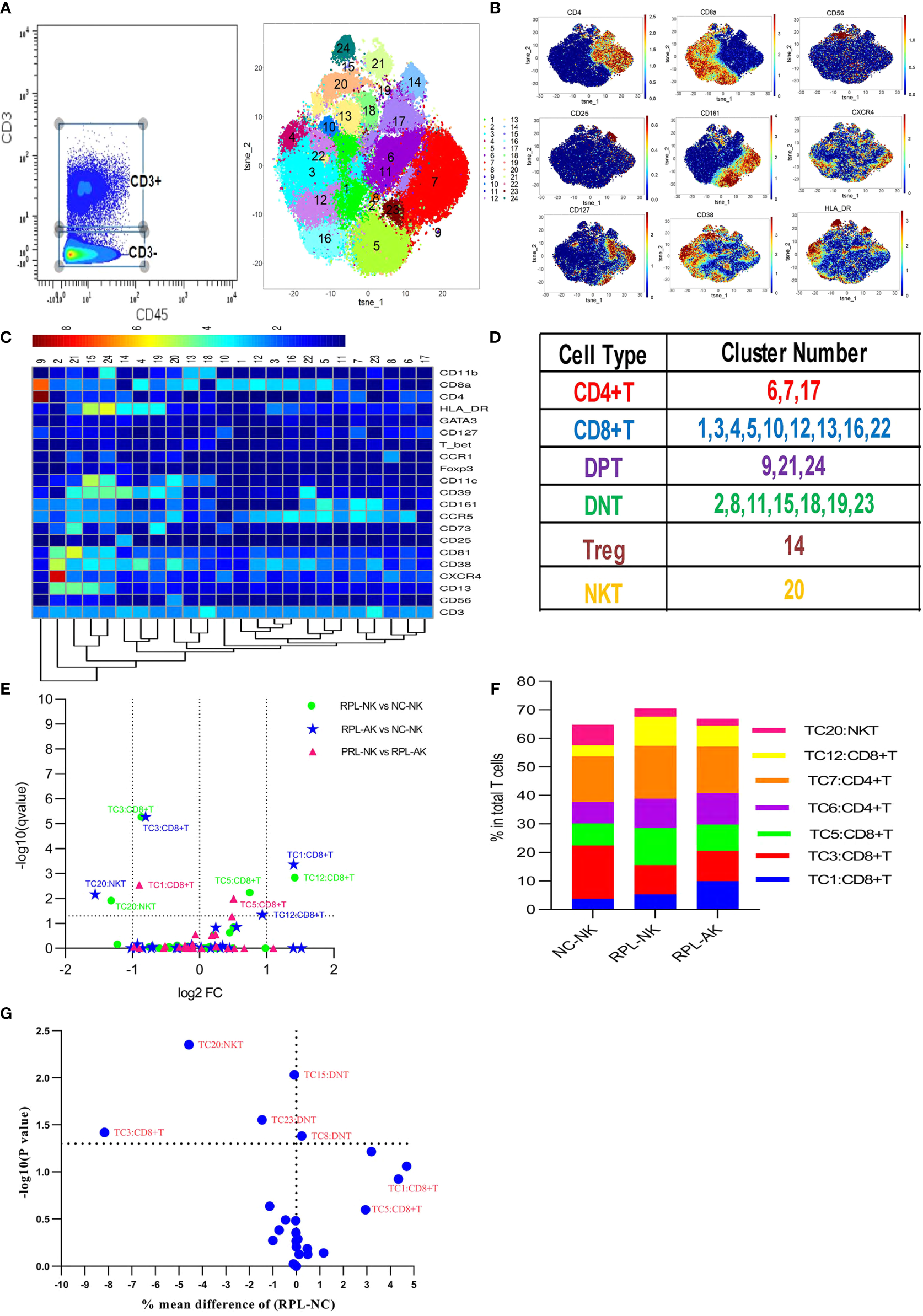 CD3+ T-cell cluster analysis. (A) CD3+ T cells manually gated on CD45+ leukocytes by CD3 expression (left) and CD3+ T-cell tSNE in all samples combined (right). (B) Expression profile of the key markers. (C) Heatmap with clusters and the expression of markers in CD3+ T cell. (D) Sum of the clusters for each subset. (E) Volcano plot showing the differential clusters when RPLs were stratified by embryonic chromosome. (F) Map with cumulative mean values for differential clusters and/or the most abundant three clusters. (G) Volcano plot showing the differential clusters when not stratified.