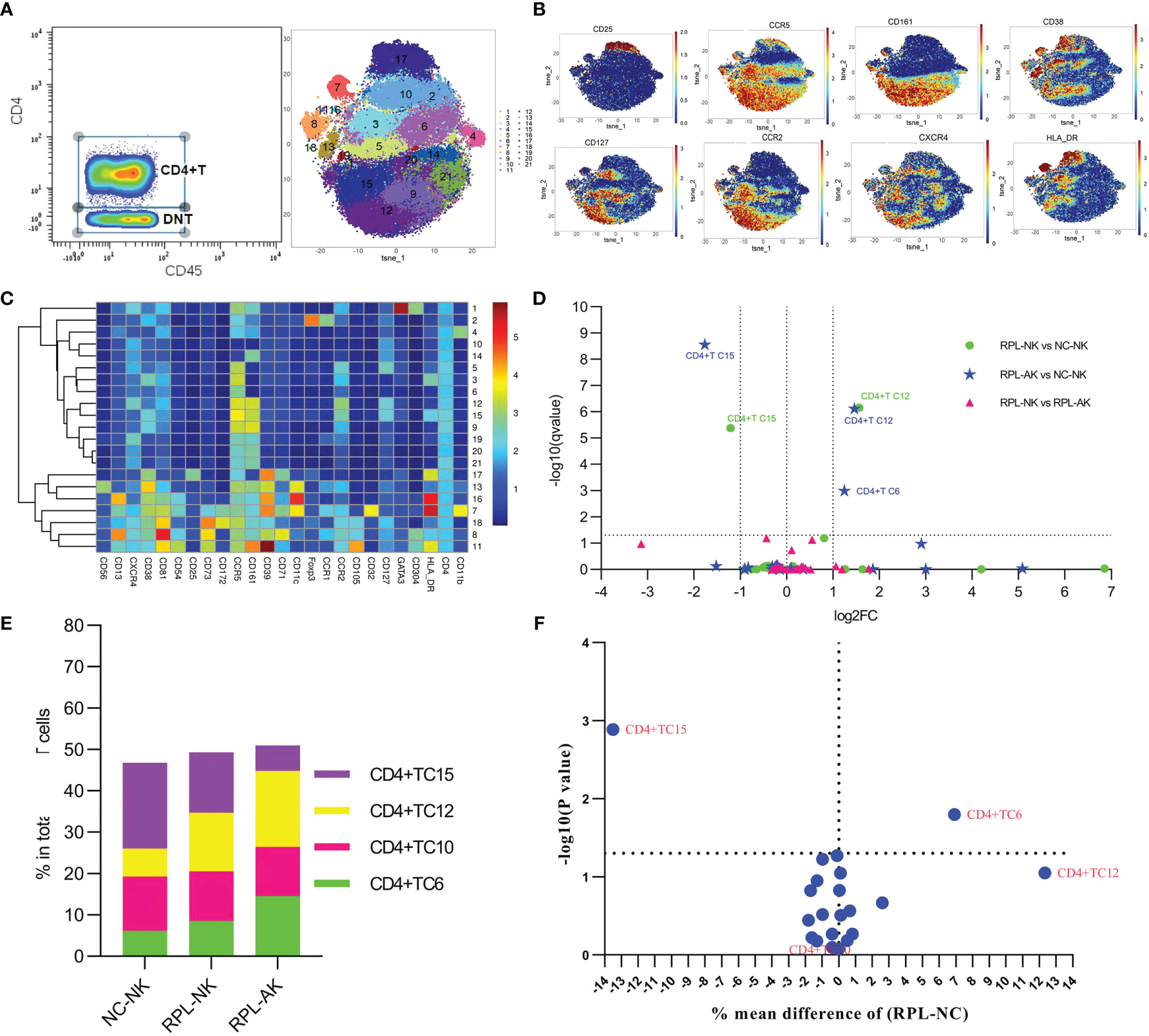 In-depth analysis of CD4+ T cells. (A) CD4+ T cells manually gated on concatenated CD45+CD3+CD8− population (left) and CD4+ T-cell tSNE in all samples combined (right). (B) Expression profile of the key markers. (C) Heatmap with clusters and the expression of markers in CD4+ T-cell clusters. (D) Volcano plot showing the differential clusters when RPLs were stratified by embryonic chromosome. (E) Map with cumulative mean values for differential clusters and/or the most abundant three clusters. (F) Volcano plot showing the differential clusters when RPLs were not stratified.