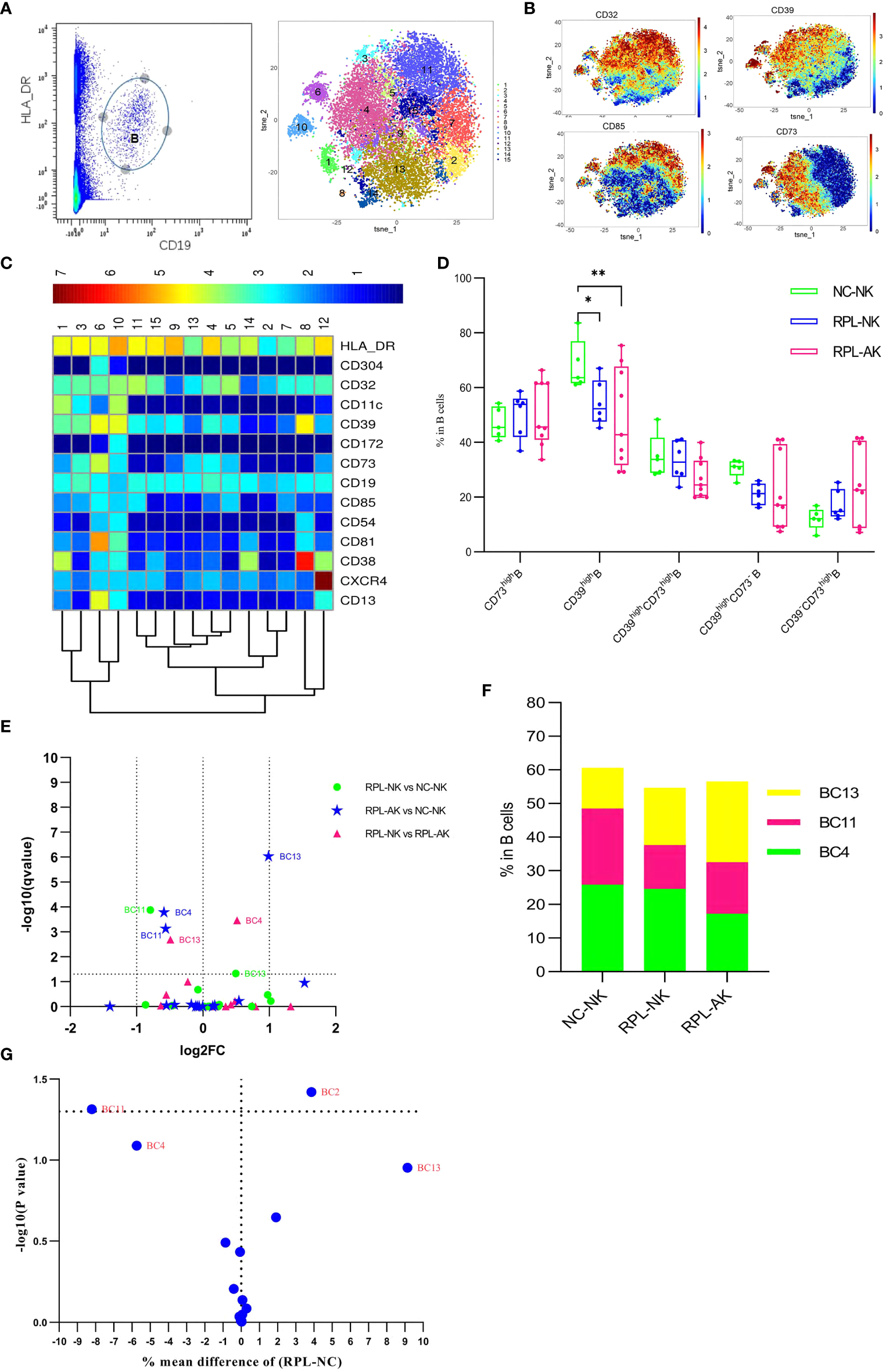 B-cell cluster analysis. (A) B cell manually gated on concatenated CD45+CD3− population (left) and B-cell tSNE in all samples combined (right). (B) Expression profile of key markers. (C) Heatmap with clusters and the expression of markers in CD45+CD3−CD19+HLA-DR+ population. (D) Box plot showing the comparison of total CD39high Breg cell when RPLs were stratified by embryonic chromosome. (E) Volcano plot showing the differential clusters when RPLs were stratified. (F) Map with cumulative mean values for differential clusters and/or the most abundant three clusters. (G) Volcano plot showing differential clusters when RPLs were compared as an entirety. * adjusted P < 0.05, ** adjusted P < 0.001.