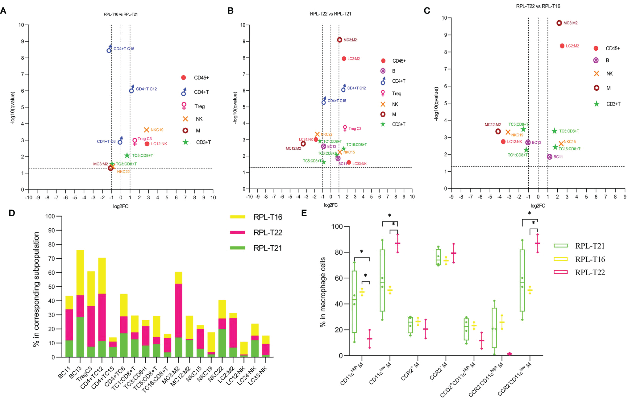 Immune atlas of RPL with embryonic aneuploidy. (A) Volcano plot showing differential clusters in RPL with embryo T16 (RPL-T16), compared with RPL with T21 (RPL-T21). log2FC >1 indicating this cluster increased more than two-fold in RPL-T16 compared with RPL-T21, and so on. (B) Volcano plot showing differential clusters in RPL with T22 (RPL-T22), compared with RPL-T21. (C) Volcano plot showing differential clusters in RPL-T16, compared with RPL-T22. (D) Map with cumulative mean values for differential clusters of RPL with embryos T21, T22, and T16. (E) Frequencies of macrophage subsets in each aneuploidy. * adjusted P < 0.05.