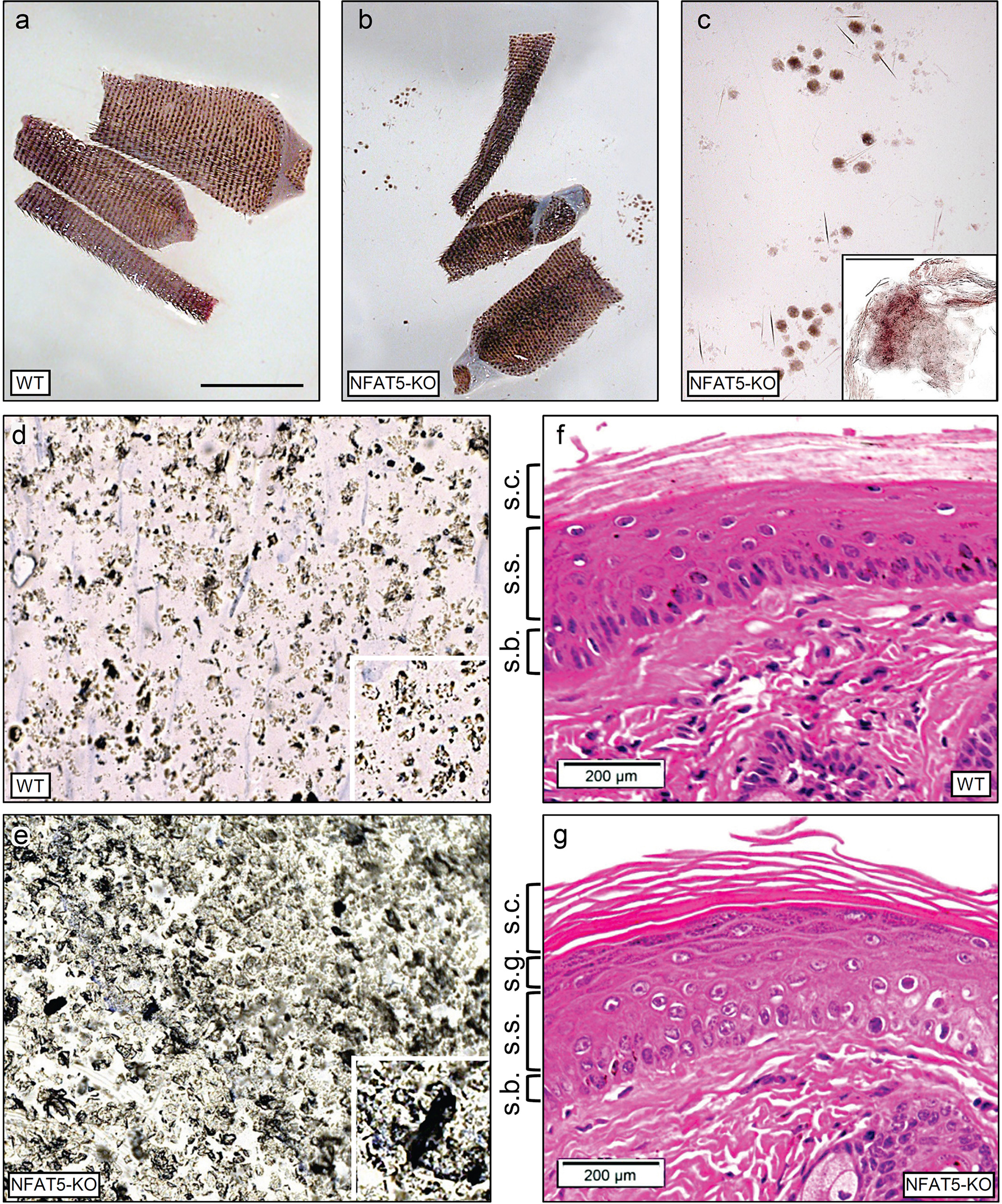 NFAT5 ablation changes the integrity and morphology of murine epidermis. (A, B) Preparations of skin from 129sv WT (A) and 129sv Nfat5-/- mice (B, C). In (C), skin sheets released from tail skin of Nfat5-/- mice are presented at larger magnification. Bar= 100 μM. (D, E) Tape strips from the tails of WT (D) and Nfat5-/- mice (E). One representative strip of more than ten is shown. (F, G) Representative H&E stains of skin sections from tails of WT (F) and Nfat5-/- mice (G). s.c., stratum corneum; s.g., stratum granulosum; s.s., stratum spinosum; s.b., stratum basale.