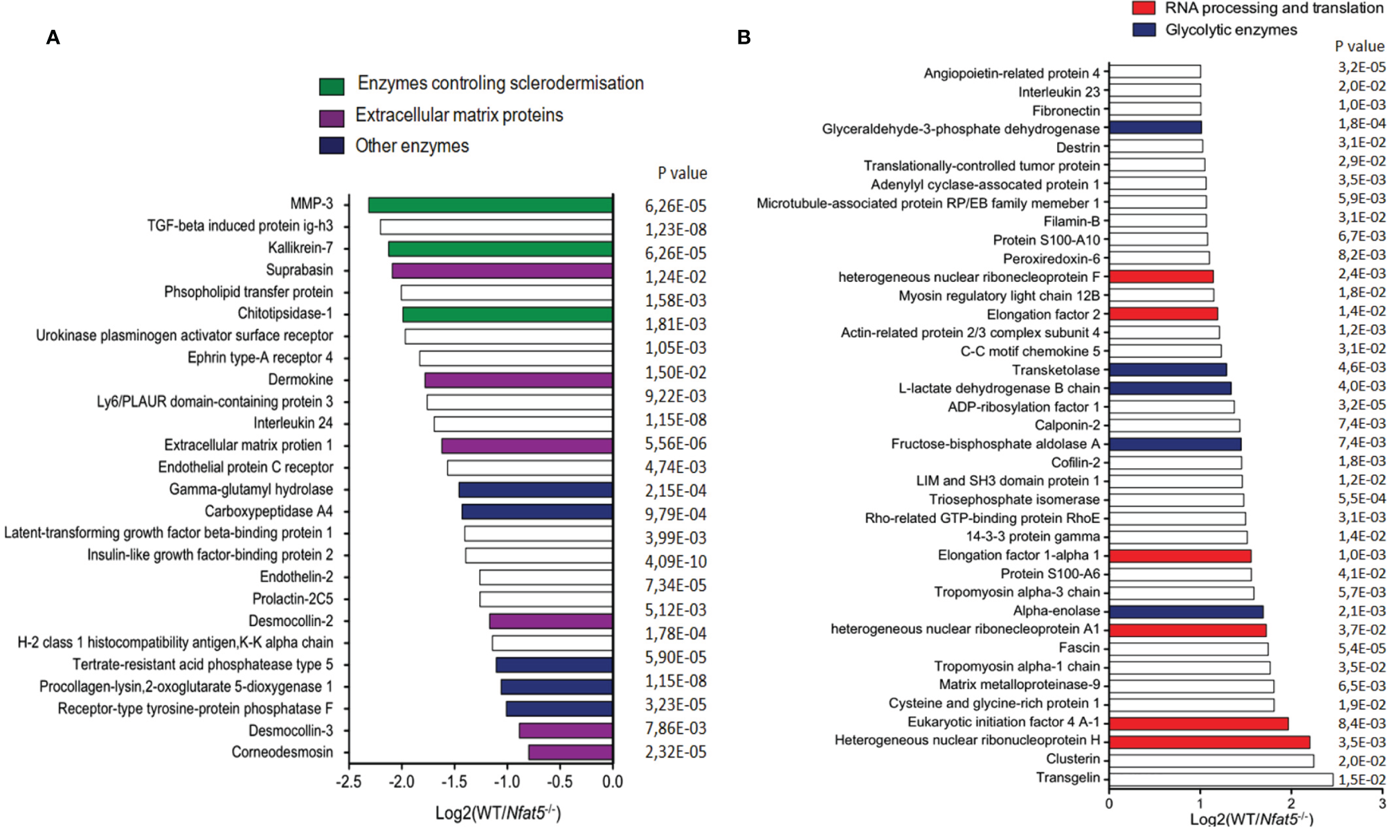 Proteins that were secreted by isolated tail KCs within 24 h of culture. (A) Proteins that were 2-fold and more secreted by 129sv Nfat5-/- than 129sv WT KCs. (B) Proteins that were at least 2-fold less secreted by Nfat5-/- than WT KCs. Data of two independent experiments each analyzed in triplicates by LC-MS were compiled.