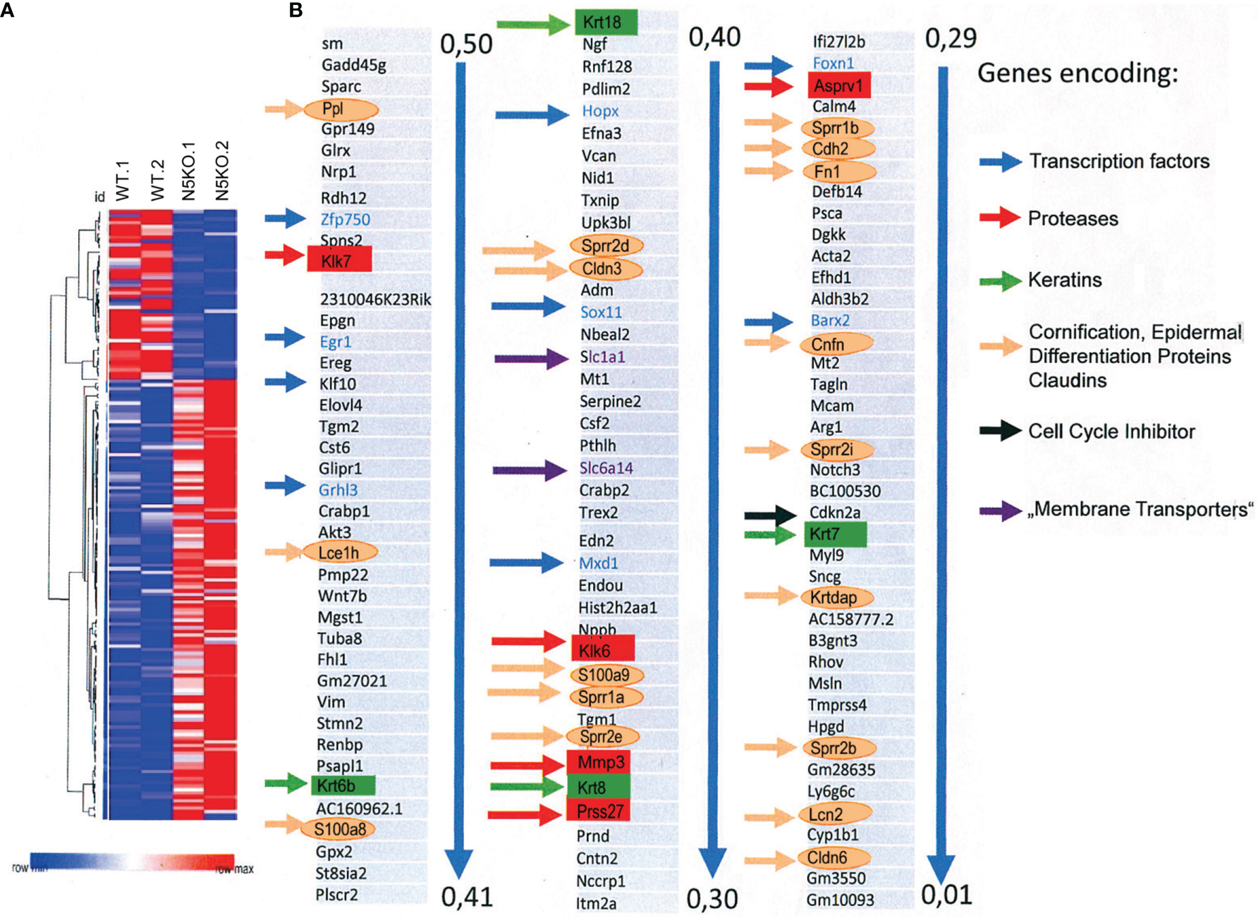 Ablation of NFAT5 changed gene expression in cultivated KCs. (A) Heat map of 168 genes that were changed at least twofold in 129sv Nfat5-/- compared to 129sv WT KCs. (B) Compilation of 121 genes that were expressed in 2-fold more copies in Nfat5-/- KCs. Nine genes encoding TFs are shown in blue and indicated by blue arrows. Five protease genes are boxed and shown in red, four keratin genes are shown in green boxes and by green arrows. The gene coding for the cell cycle inhibitor Cdkn2a is shown in black, genes encoding membrane transporters are shown violet, and the numerous genes encoding Epidermal Differentiation Complex (EDC) proteins, claudins and other ‘cornification` proteins are encircled and presented in orange.
