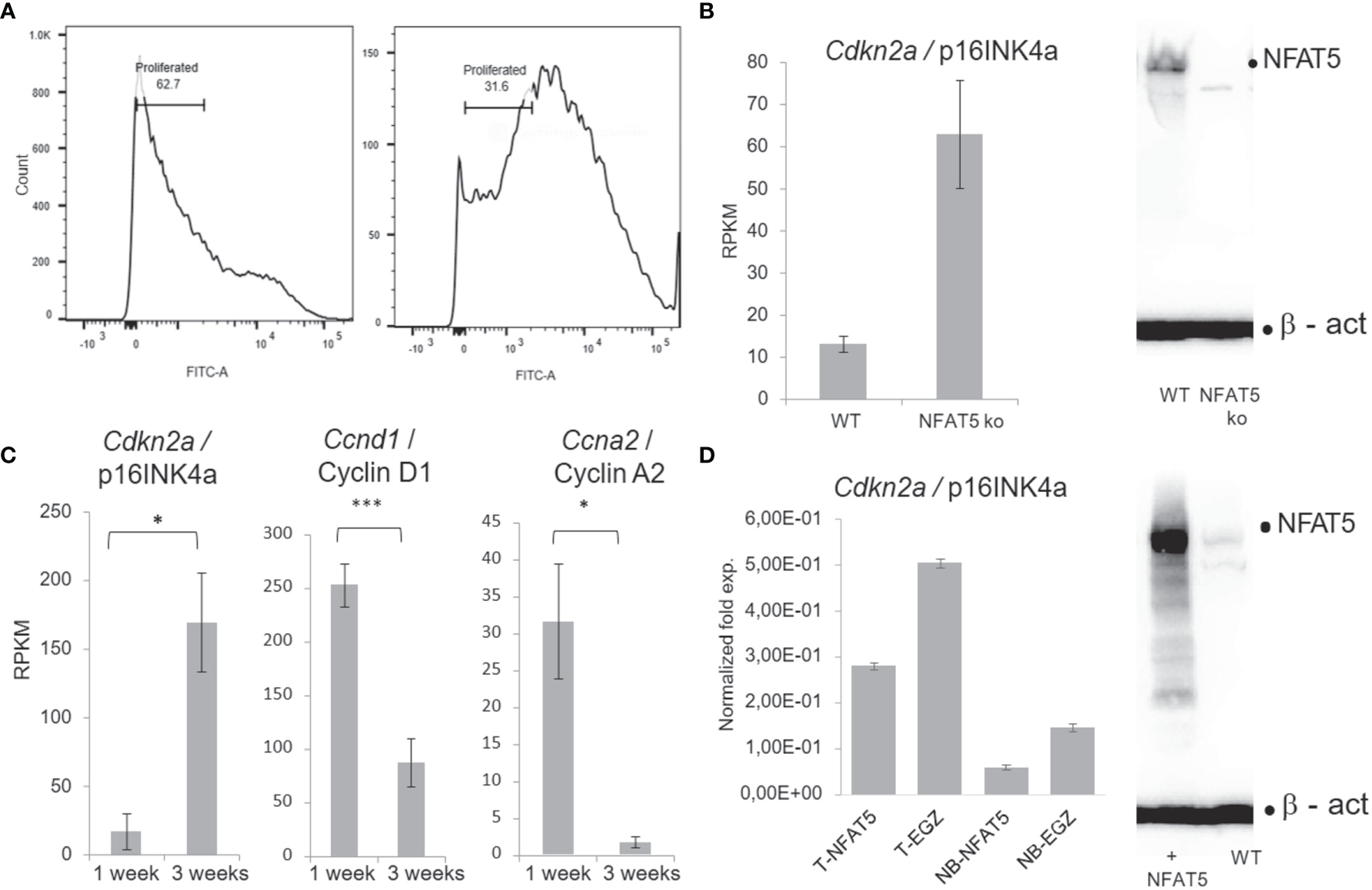 NFAT5 supports the proliferation of KCs. (A) Measurement of KC proliferation cultivated for one week (left) or three weeks (right) in CFSE assays. (B) Increase of p16INK4a RNA levels in KCs upon NFAT5 ablation. The western blot (right) confirms the absence of NFAT5 expression in KCs isolated from Nfat5-/- mice. (C) Expression of cell cycle inhibitor p16INK4a and of cyclins D1 and A2 in KCs cultivated for one or three weeks. Next-generation-sequencing (NGS) data of four independent batches of KCs cultured for 1 or 3 weeks are shown. (D) Decrease in p16INK4a RNA levels in KCs isolated from the tails of adult (T) or from newborn mice (NB). The western blot illustrates increased NFAT5 levels in tail KCs that have been transduced with a retrovirus expressing NFAT5. The KCs in (C, D) were cultivated for 1 week. (***p<0.0001, **p<0.001 and *p<0.05).
