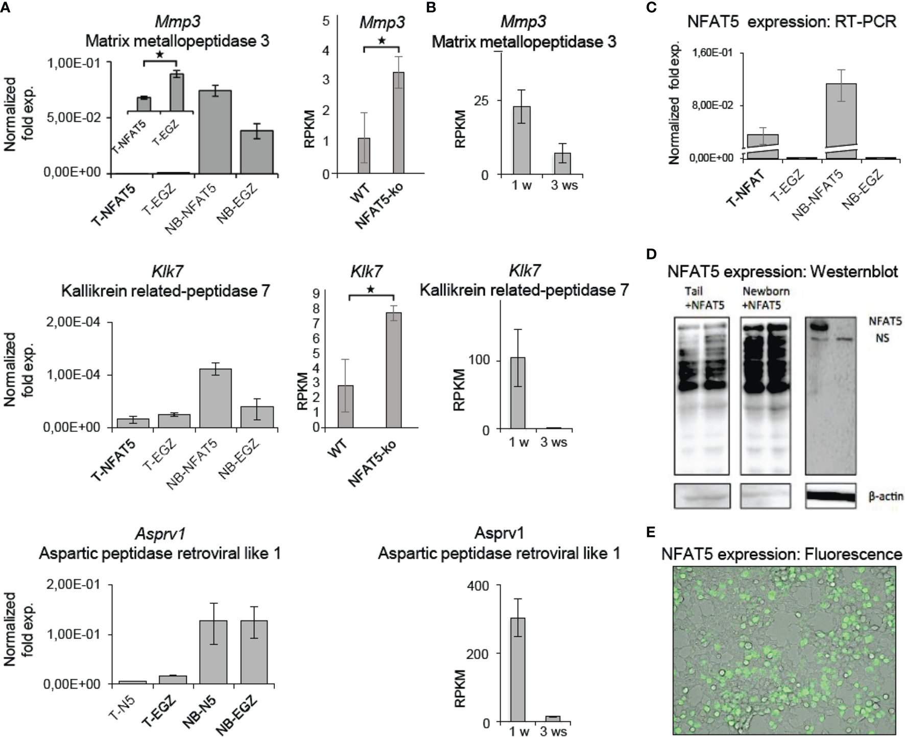 NFAT5 affects the expression of Mmp3, Klk5 and Asprv1 protease genes in KCs. (A) Left panels, results of qRT-PCR assays showing the effect of NFAT5 on the expression of Mmp3, Klk7 and Asprv1 genes upon transduction of KCs obtained from the tails of adult ice (T) or from the skin of newborn (NB) mice. Right panels, effect of NFAT5 ablation on Mmp3 and Klk7 expression. Results of 3 independent NGS assays are shown. (B) Expression of protease genes in KCs cultured for 1 or 3 weeks (ws). NGS data of three independent batches of KCs cultured for 1 or 3 ws are shown. (C–E) Detection of NFAT5 expression upon transduction of KCs. Cultured KCs were transduced with retroviruses expressing NFAT5, or with an ‘empty’ EGZ virus. (C) Detection of human NFAT5 RNA by RT-PCR assays in tail (T) and NB KCs upon transduction. (D) Western blots showing the expression of NFAT5 upon transduction of KCs from newborn and tails of adult mice. (E) Fluorescence microscopy of NFAT5-GFP expression in transduced adult KCs. (*p<0.05).