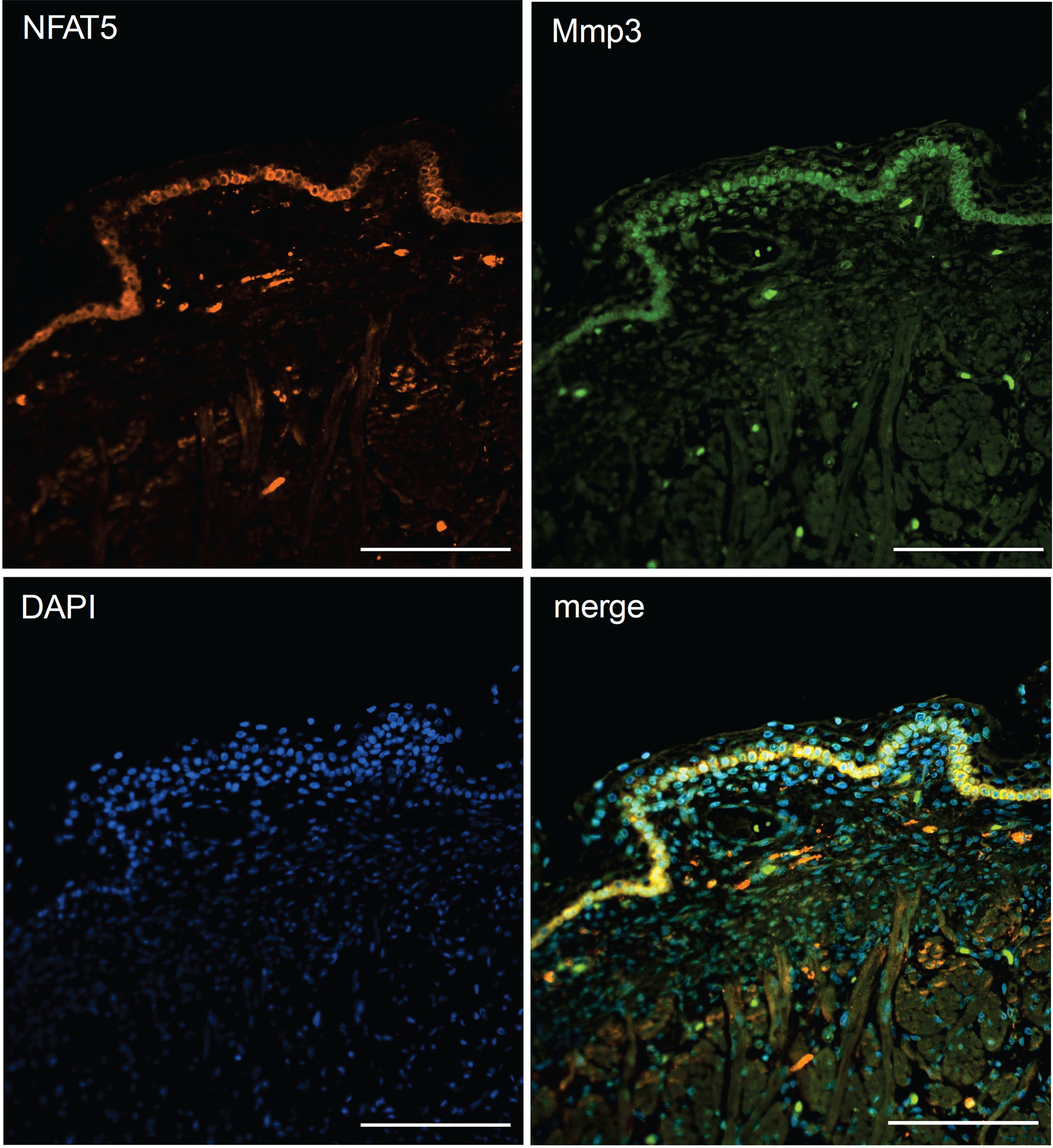 Immunofluorescence of sections through the skin of a human fetus. Sections were stained with Abs against NFAT5 (ab110995, Abcam) and Mmp3 (AF513, Novus Biologicals) and counterstained with DAPI as indicated. Length of the bars: 100 μm.