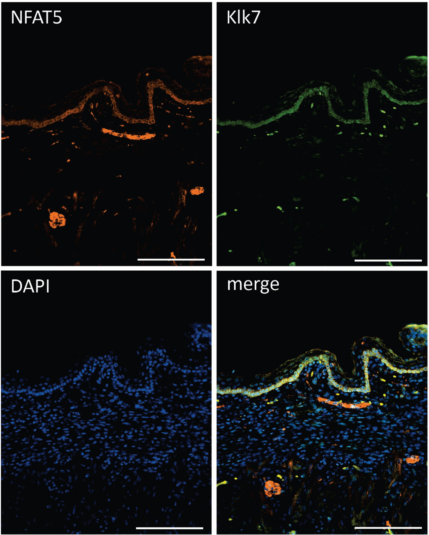 Immunofluorescence of sections through the skin of a human fetus. Sections were stained with Abs against NFAT5 (ab110995, Abcam) and Klk7 (Biotechn/R+D Systems, No.: AF2624) and counterstained with DAPI as indicated. Length of the bars: 100 μm.