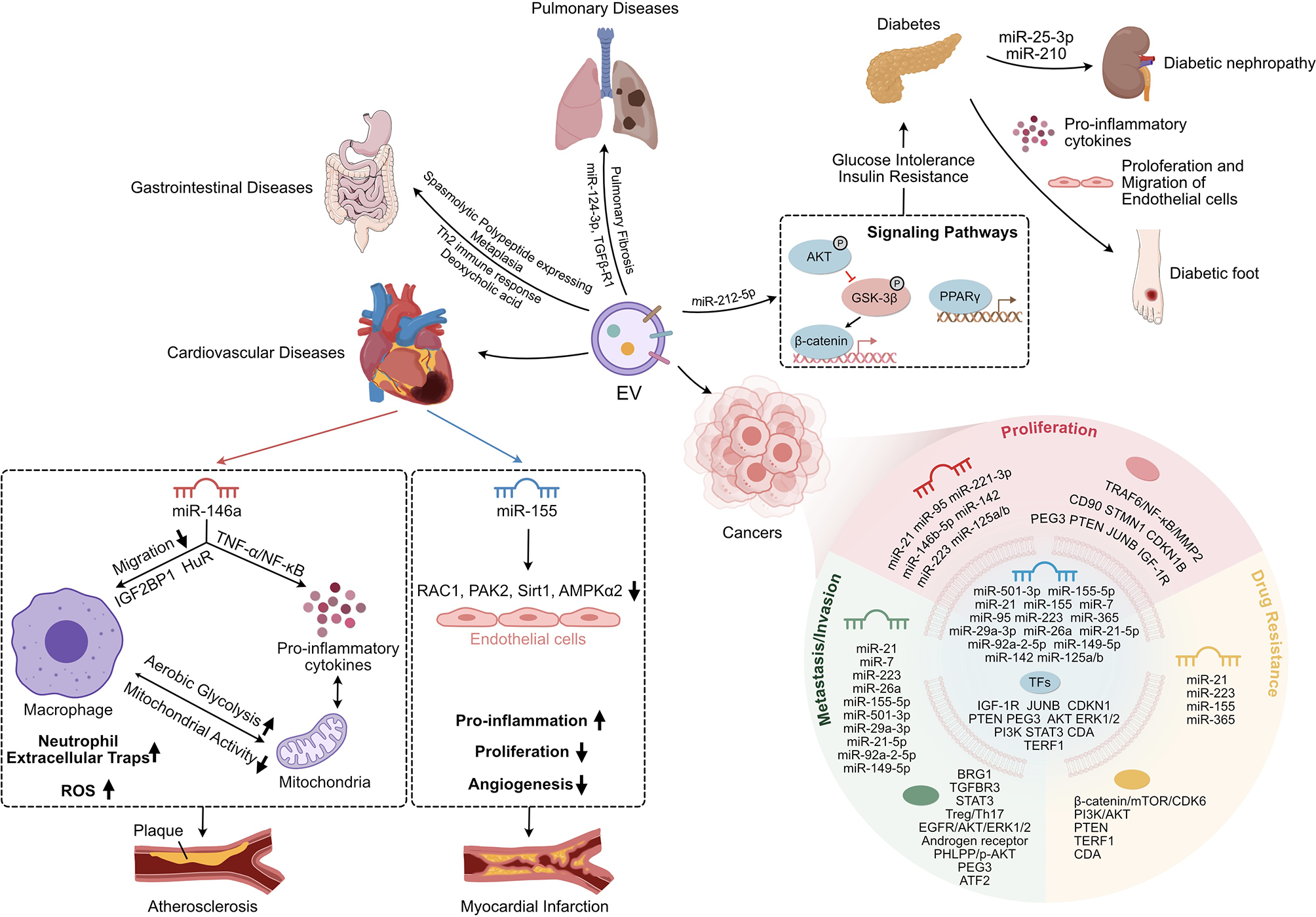 Many complications can occur during the late stages of diabetes. The persistence of diabetic inflammation activates inflammatory cells, which secrete inflammation-associated cytokines (130). A common complication of diabetes is difficulty healing. Mφ-EVs show a remarkable decrease in the release of pro-inflammatory cytokines, enhancing the proliferation and migration of endothelial cells and accelerating wound healing via their anti-inflammatory effects (131). Similar research has shown that M1-EVs can regulate Mφ phenotypic reprogramming, repolarizing M1Mφ to M2Mφ, which in turn promotes wound healing (132). Bone homeostasis is also disturbed by diabetes mellitus. Zhang et al. isolated EVs from diabetic bone marrow-derived Mφ and found that they transport miR-144-5p, which inhibits osteogenesis differentiation by targeting Smad1 and suppressing facture repair in vivo (58). Diabetic nephropathy is a peripheral small artery occlusive disease caused by diabetic neuropathy and lower extremity vasculopathy. M2-EVs that transport miR-25-3p may alleviate podocyte injury induced by high glucose levels by activating autophagy of the cells through suppression of DUSP1 expression (133). Zhu et al. found that Mφ-derived EVs treated with high levels of glucose might activate glomerular mesangial cells through the TGF-β1/Smad3 pathway, promote proliferation, and induce the production of fibrotic and inflammatory factors (31). Similarly, high-glucose-treated Mφ-derived EVs induce overexpression of inflammatory cytokines and activate NF-κB p65 signaling pathways (134). ATM-EVs contain high levels of miR-210, and miR-210 in ATM-EVs has been shown to regulate glucose uptake and mitochondrial chain complex IV activity by targeting NDUFA4 gene expression, which promotes the pathogenesis of diabetes (59).