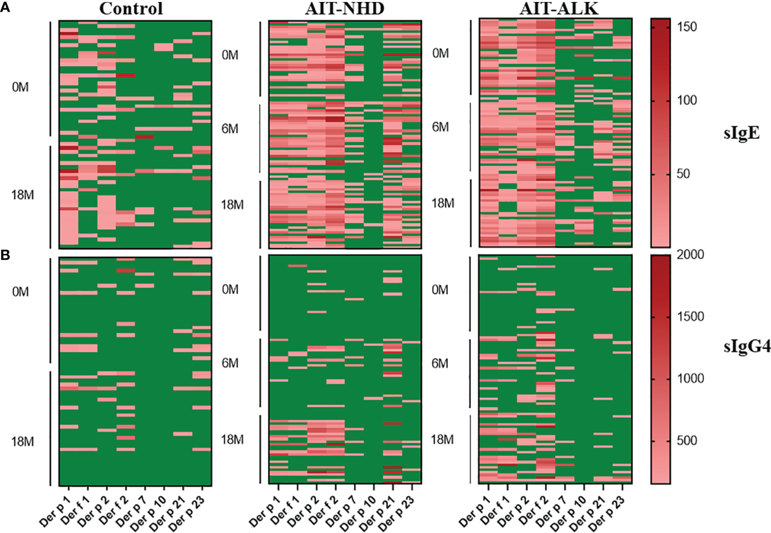 Heatmap visualization of sIgE and sIgG4 to HDM components of the 30 control patients and 60 AIT patients. Each row represents 1 patient, with green color for the concentrations below 0.35IUm/L for sIgE and 156UAm/L for sIgG4; red color for sIgE above 0.35IUm/L and sIgG4 above 156UAm/L from light red to dark red as the concentration increases. (A) sIgE levels at 0M and 18M in the control group; sIgE levels at 0M, 6M and 18M in the AIT groups; (B). sIgG4 levels at 0M and 18M in the control group; sIgG4 levels at 0M, 6M and 18M in the AIT groups.