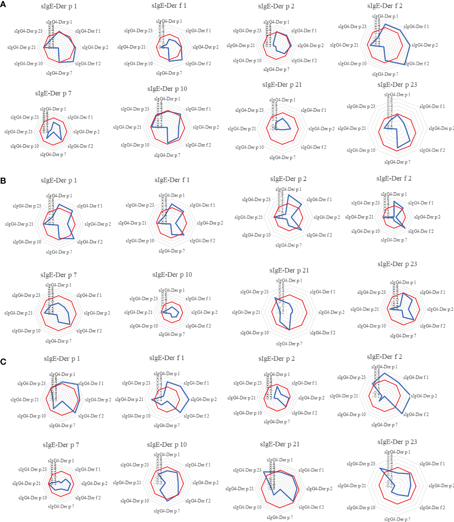 The allergen sensitization profile may also have an impact on AIT. The quality of HDM allergen extracts used for AIT is usually standardized by the major components such as Der p 1 and Der p 2 but not all components (13). It is possible that the allergen components in HDM extracts are not well-matched with the HDM sensitization profile of an individual, which may lead to attenuated response to AIT. It has been estimated that non-responder may comprise up to 30% of patients treated with AIT (14). We hypothesize the HDM component sIgE and sIgG4 profile plays an important role in AIT. However, the data of longitudinal evolution of sIgE and sIgG4 against HDM components during AIT is limited. Some studies provided cross-sectional IgG4 data rather than longitudinal profiles. Therefore, the aim of this study was to investigate the profiles of sIgEs and sIgG4s generated against HDM components over 18 months of AIT and to assess if they could be potential biomarkers to evaluate the AIT responses.