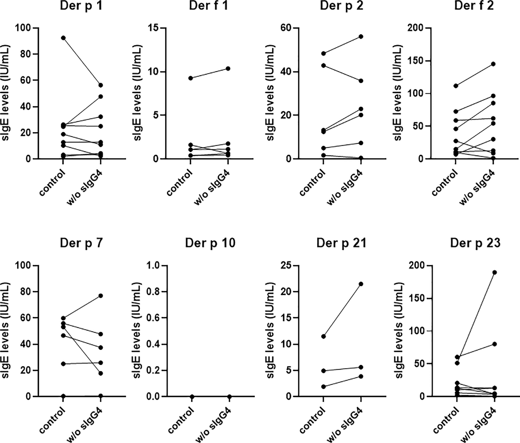 The capacity of IgG4 to block binding of IgE to HDM allergens. sIgE levels against HDM components of 9 AIT patients after 18 months. Only the positive sIgE of the eight HDM components were shown and compared here. w/o sIgG4 presents the sIgE of serum deletion of sIgG4.