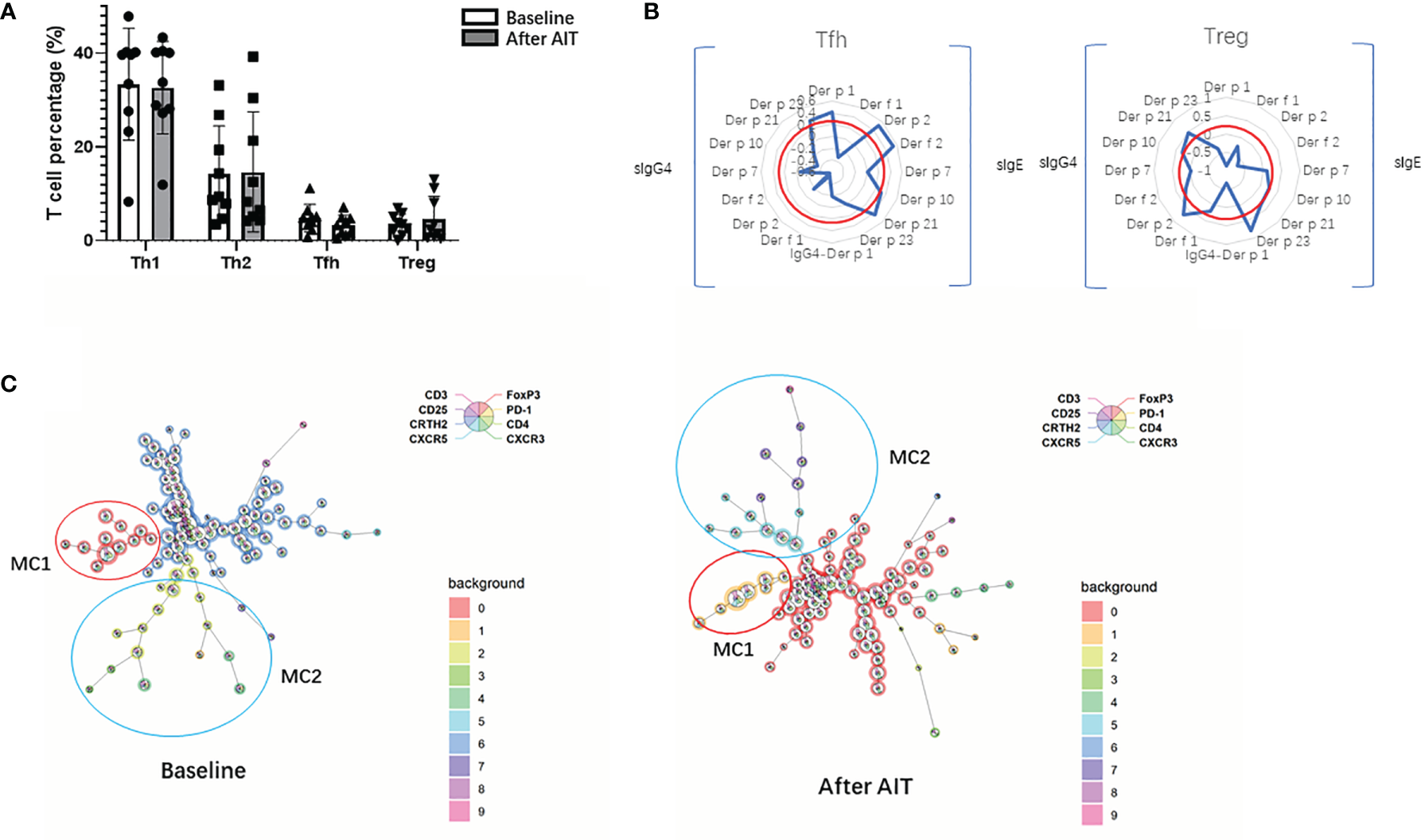 CD4+ T cell subsets and correlation with HDM components antibodies. (A). Levels of Th1, Th2, Tfh and Treg at baseline and after AIT; (B) The Spearman correlation analysis between Tfh, Treg and HDM components antibodies. The left half part of the radar map exhibited the sIgG4 of HDM components with cells and the right part were sIgE of HDM components. ρ = 0.3were labeled as red octagonal box; (C) Spanning tree visualization of a self-organizing map using compensated flow cytometric data. Data were taken from the lineage (CD3+, CD4+) gate. FlowSOM nodes represent clusters of cells. Metaclusters of the nodes, determined by the map, are represented by the background color of the nodes.