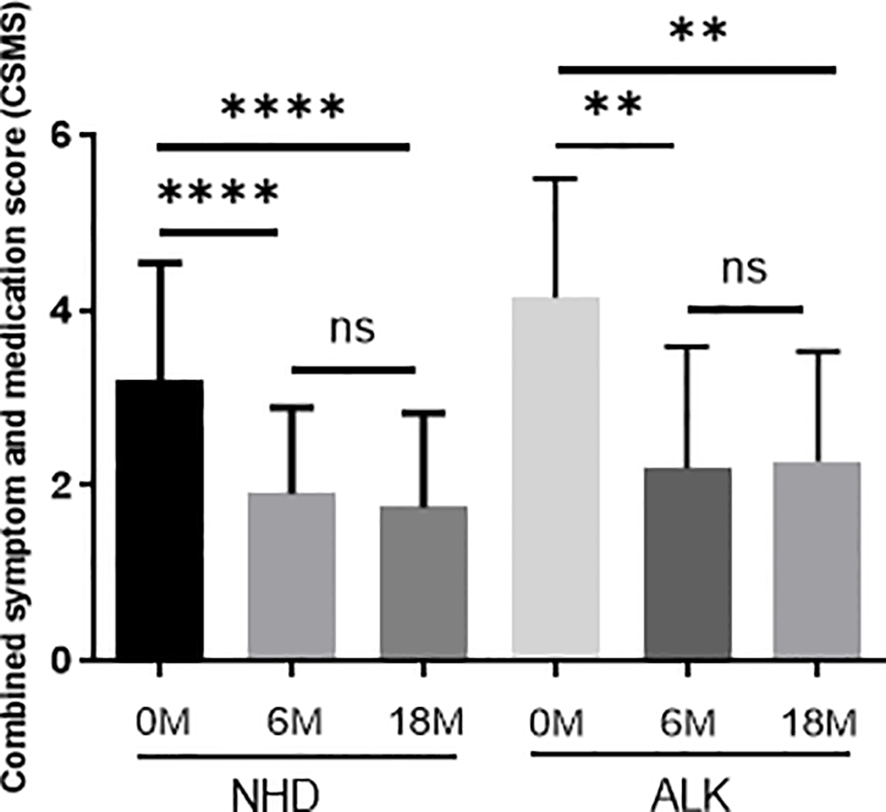 The symptom and medication scores during 18 months of AIT. The data were presented by the change from baseline (after treatment minus before treatment); the horizontal bars show the mean with 95% confidence limits. 0M=0 month; 6M = 6 months of AIT; 18M = 18 months of AIT.(ns > 0.05; **p < 0.01; ****p < 0.0001).