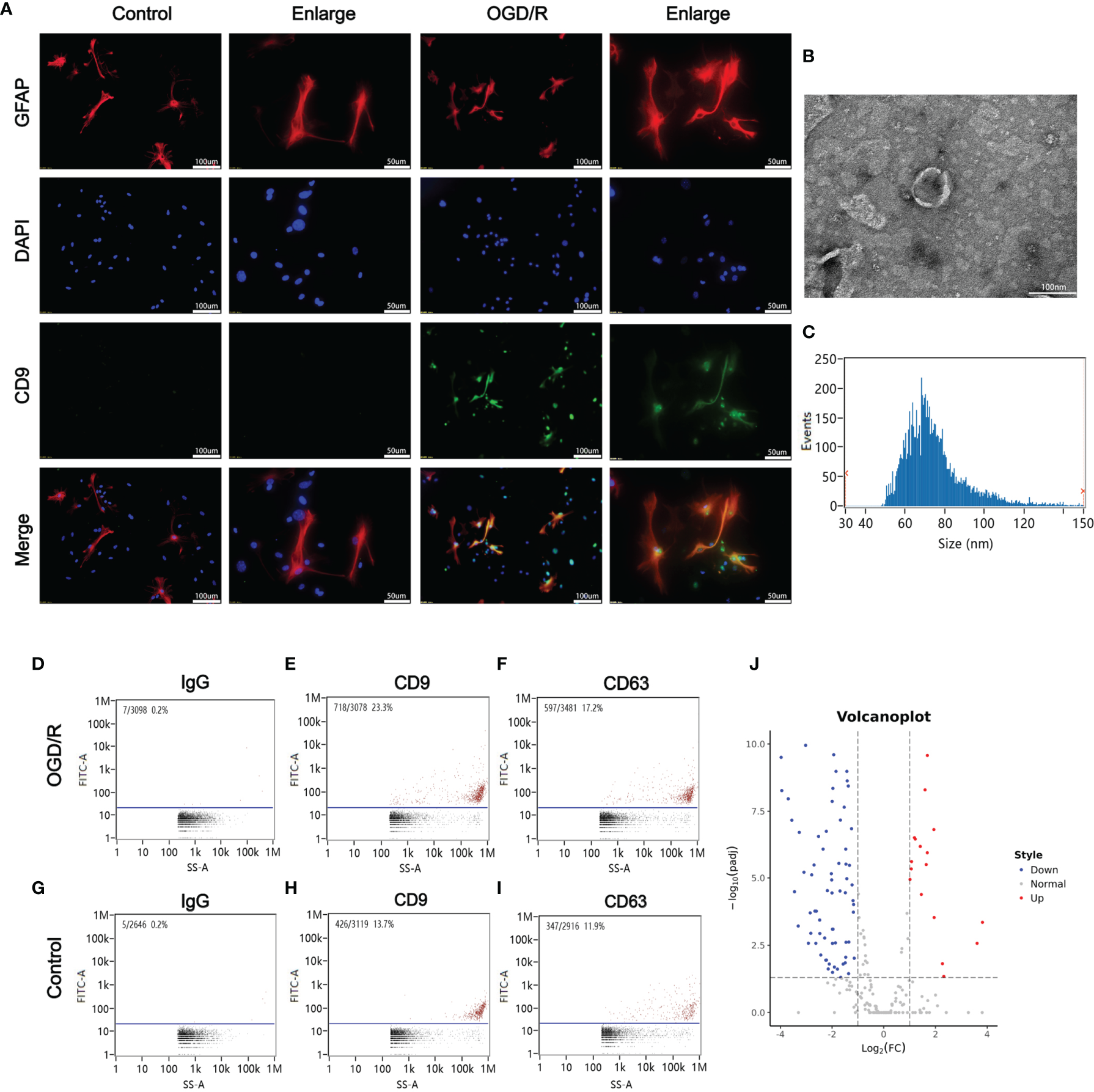 Oxygen glucose deprivation/reoxygenation (OGD/R) stimulated the release of astrocytes-derived exosomes. (A) Astrocytes-derived exosomes were significantly increased under oxygen glucose deprivation 4 h/reoxygenation 8 h (OGD 4 h/R 8 h). (B) A representative TEM image of purified exosomes of stimulated astrocytes after OGD/R. Scale bar 100 nm. (C) Particle size analysis of exosome samples detected by particle size analyzer. (D–F) The exosomes from the OGD/R-stimulated astrocytes were identified by CD9 and CD63 using nano-flowcytometry. (G–I) The exosomes from the control astrocytes were identified by CD9 and CD63 using nano-flowcytometry. (J) The miRNA distribution. The horizontal axis represents multiple miRNAs in the OGD/R group vs. those in the control group, and the vertical axis represents the Log10 of the p-value.