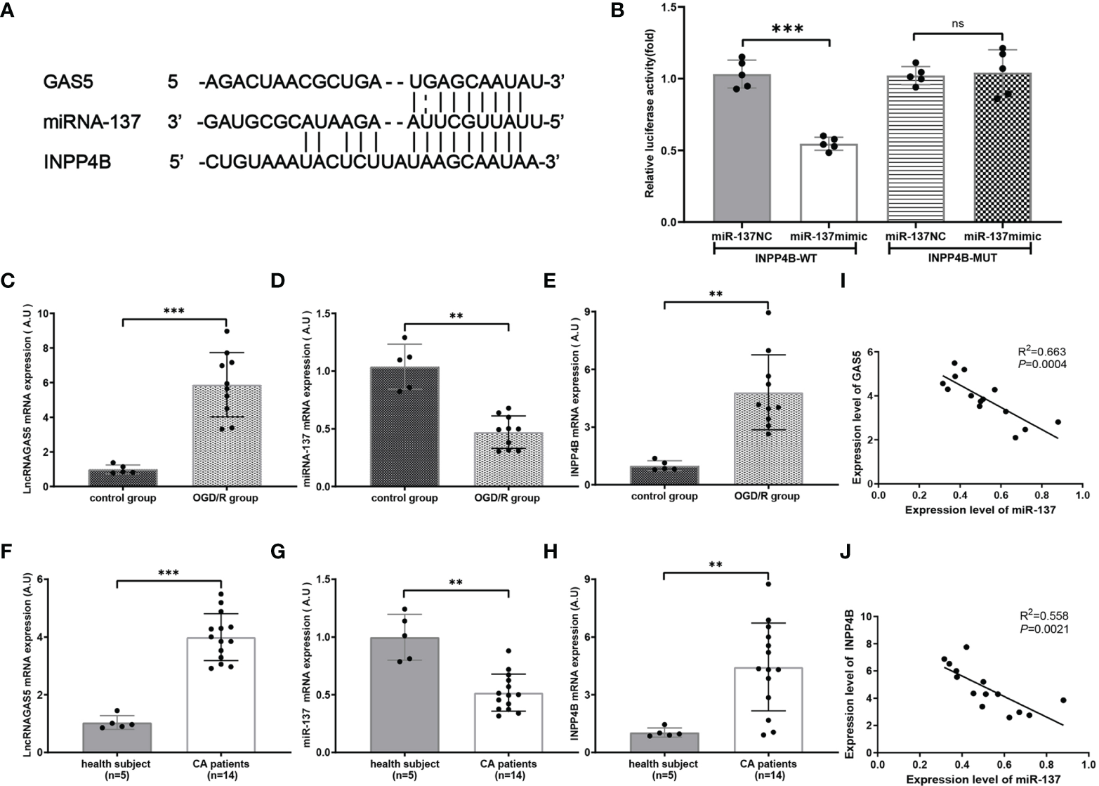 In all the micRNAs, miR-137 was among the top 10 micRNAs that experienced greatest changes, in both the blood of CA/CPR patients and supernatant of OGD/R-stimulated astrocytes. Bioinformatic analysis revealed that miR-137 was sponged by lncRNA GAS5, targeting INPP4B, and the result was confirmed by Luciferase activity assay. qRT-PCR and Western blotting showed that lncRNA GAS5 and INPP4B were over-expressed whereas miR-137 was downregulated in the blood of CA/CPR patients, OGD/R-stimulated astrocytes, and brain tissue of CA/CPR mice. Silencing lncRNA GAS5 suppressed INPP4B expression, but over-expression of miR-137 negatively modulated its expression. Western blotting exhibited that PI3K and Akt phosphorylation was increased when lncRNA GAS5 was silenced or miR-137 was over-expressed. However, PI3K and Akt phosphorylation was notably suppressed in the absence of miR-137, almost reversing their phosphorylation in the silencing lncRNA GAS5 group. Then we found that GAS5 siRNA or miR-137 mimic significantly increased cell viability and alleviated apoptosis after OGD/R injury. Furthermore, over-expression of miR-137 attenuated microglial apoptosis and neuroinflammation in CA/CPR mice model, exhibiting significantly better behavioral tests after CA/CPR.