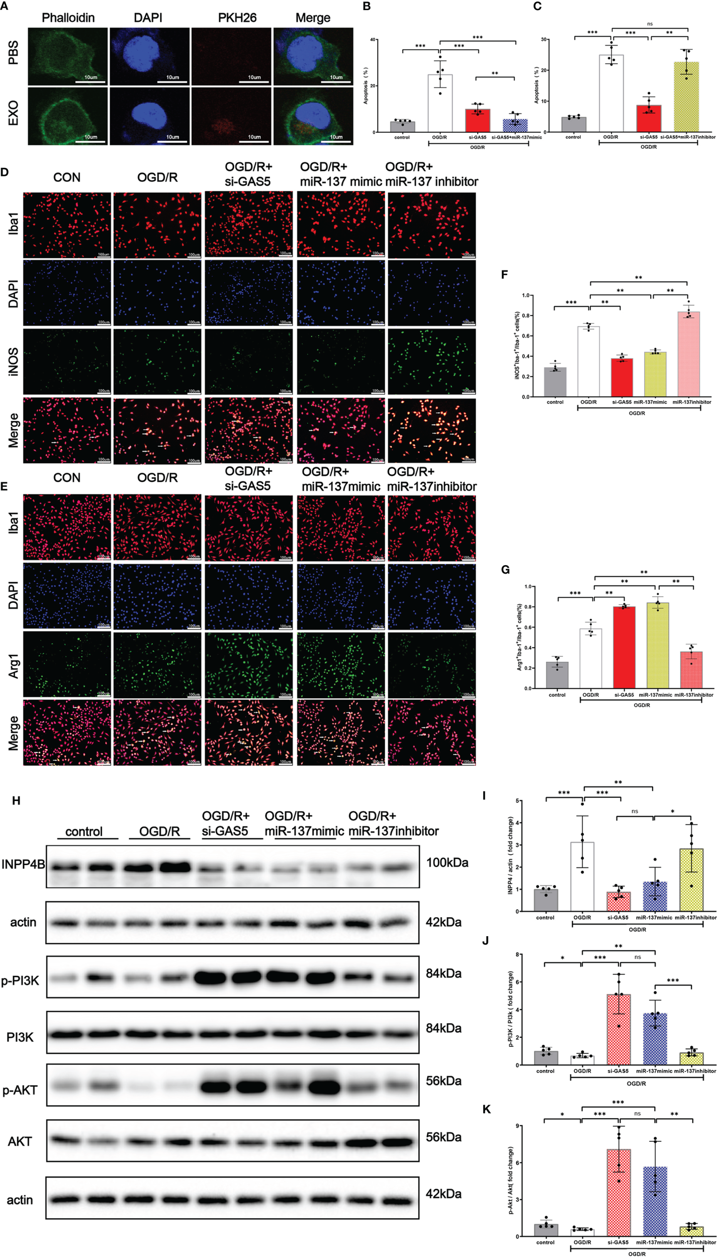 In this study, an OGD/R cell model was constructed to investigate the microarray of astrocyte-derived exosomes, their effect on apoptosis and transformation of microglia phenotypes. Moreover, based on the miRNA-seq analysis, literature research (27), and bioinformatic study, a crucial LncRNA–microRNA–mRNA axis that regulates the course of acute systemic ischemia/reperfusion injury was identified. By gain-of-function and loss-of-function experiments, we specifically examined how the LncRNA GAS5/miR-137/INPP4B axis is involved in the OGD/R-stimulated astrocyte–microglia crosstalk. Of note, our miRNA-seq results with blood samples from CA/CPR patients were consistent with those of OGD/R cell experiments.