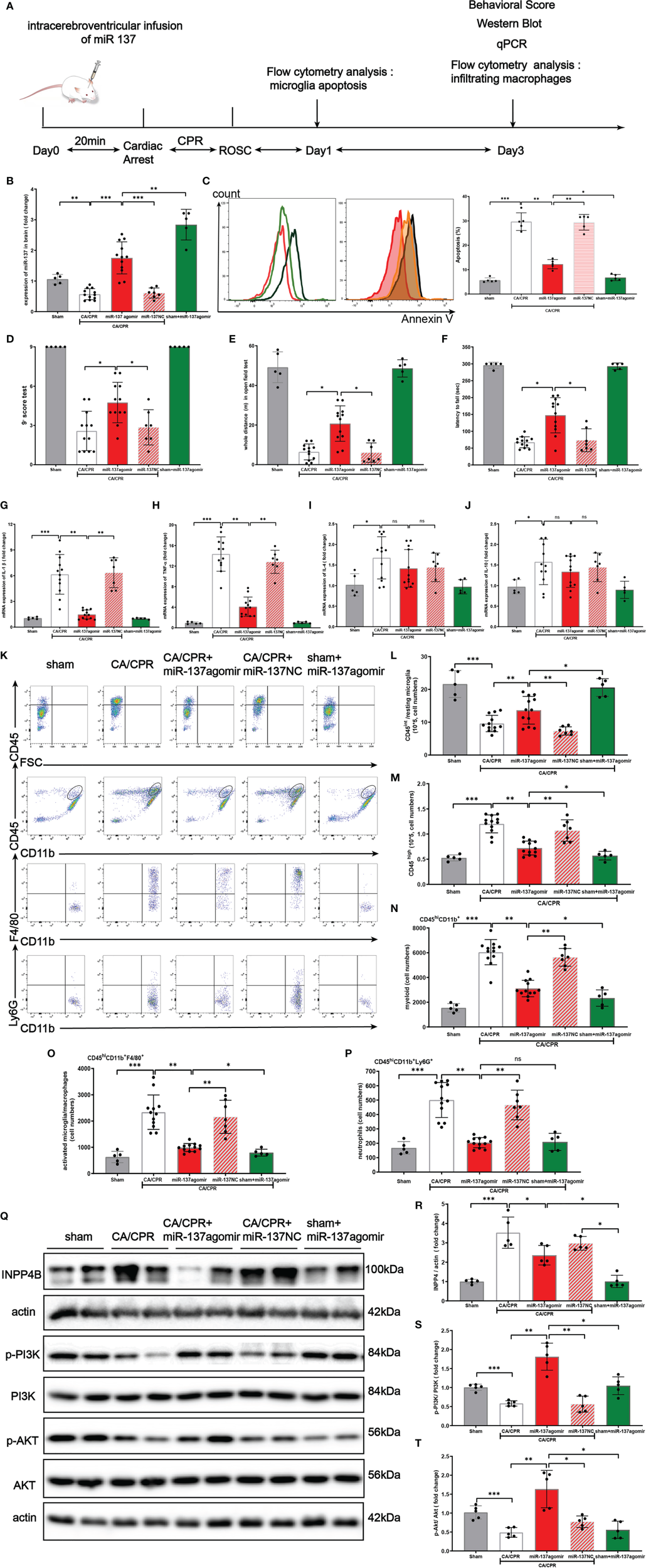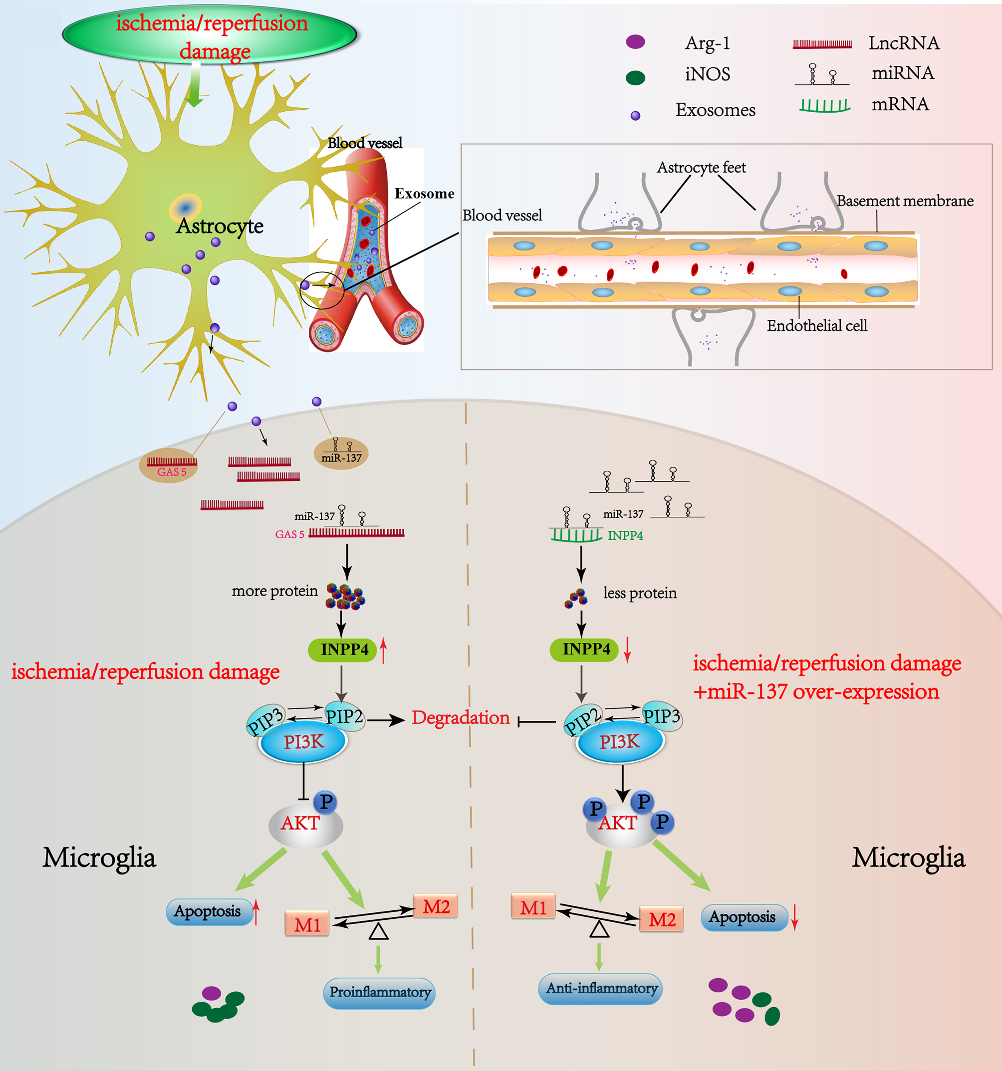 We collected and purified the exosomes from the blood of CA/CPR patients and supernatant of OGD/R-stimulated astrocytes. On the basis of microarray analysis, bioinformatic study, and luciferase activity determination, we speculated that lncRNA GAS5/miR-137 is implicated in the astrocyte–microglia crosstalk under the insult of systemic I/R injury. The regulation of lncRNA GAS5/miR-137 on INPP4B was examined by cellular transfection in OGD/R cell culture and by lateral ventricle injection with miR-137 agomir in CA/CPR mice model. Flow cytometry and immunofluorescence staining were performed to detect the microglial apoptosis, M1/M2 phenotype transformation, and neuroinflammation. Neurological scoring and behavior tests were conducted in CA/CPR group, with miR-137 agomir lateral-ventricle infusion and in their controls.