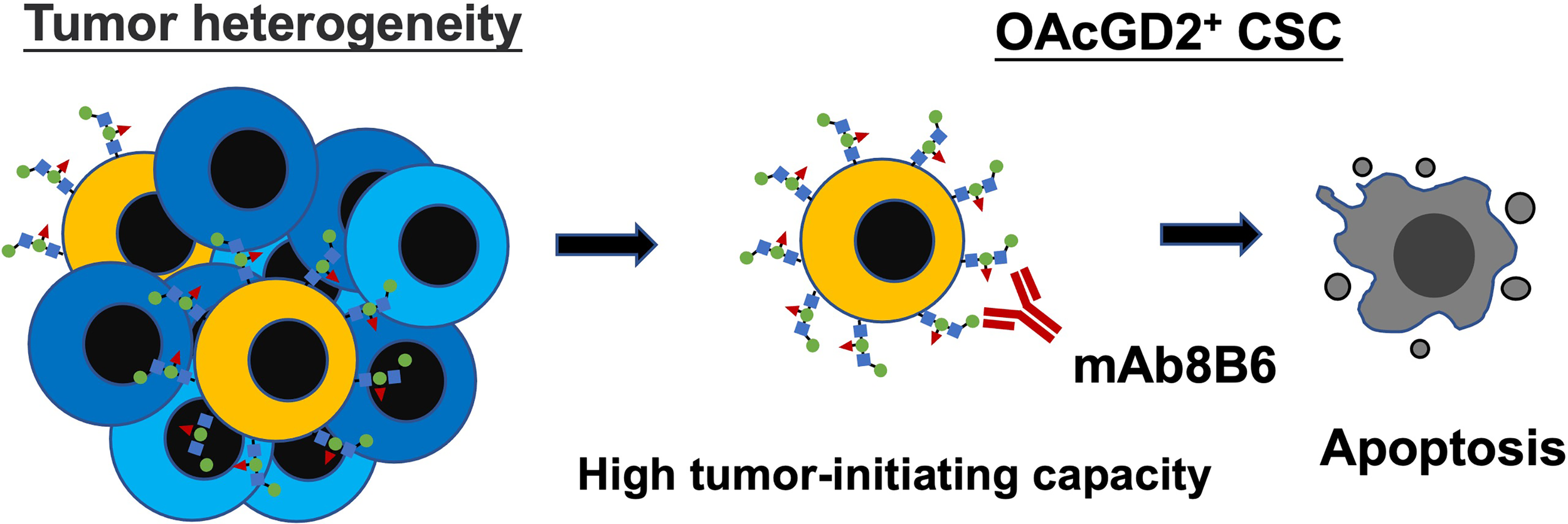Graphical abstract showing OAcGD2 as a novel marker for CSC which can be targeted with mAb8B6 to suppress tumor growth by inducing apoptosis.