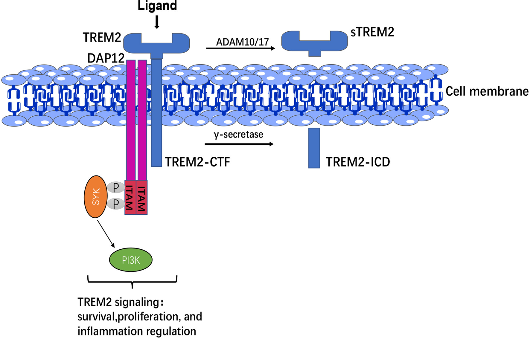 TREM2 structure and signaling. The extracellular domain of TREM2 was cleaved by ADAM 10/17 to produce sTREM2, whereas C-terminal fragment of TREM2 (TREM2-CTF) was cleaved by γ-secretase into intracellular domain (ICD). TREM2-DAP12 led to phosphorylation of ITAM, then recruitment of SYK to activate PI3K signaling and thus regulation of the survival, proliferation, and inflammatory responses of microglia.