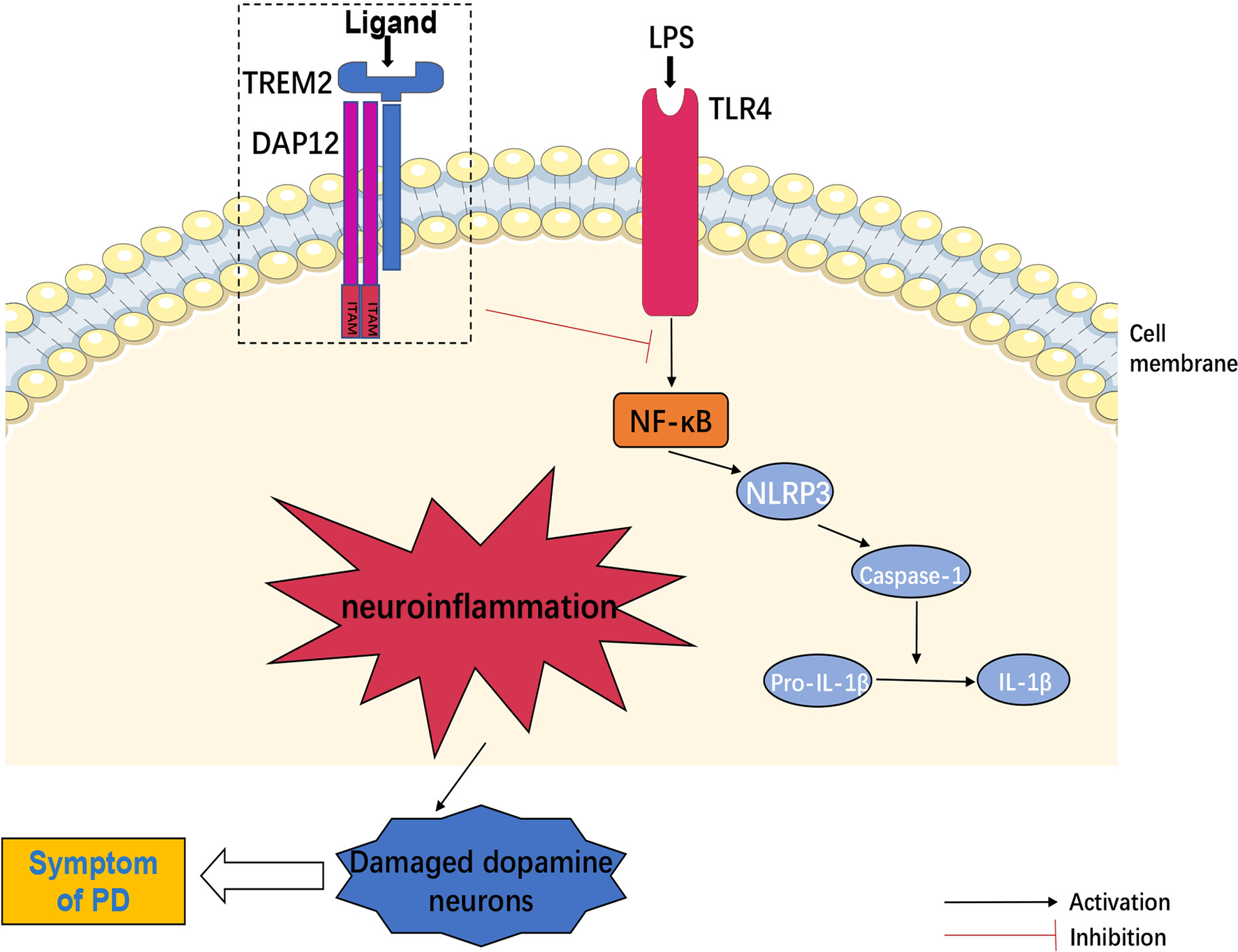 TREM2 and neuroinflammation. TLR4 mediated NLRP3 inflammasome activation in central nervous system (CNS) through regulation of NF-κB signaling pathway. NLRP3 inflammasome recruited and activated caspase-1, produced IL-1β by shearing pro-IL-1β and then induced neuroinflammation, which could damage dopamine neurons. However, TREM2 negatively regulated TLR4-mediated these neuroinflammatory signaling activation.