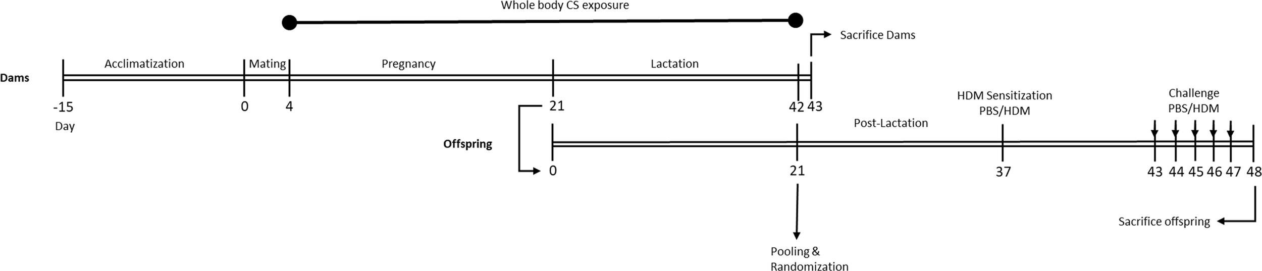 Following the acclimatization period (two weeks) and one day prior to mating, female mice were randomly housed two per cage (from the same cohort) and allocated to the control (n=30) or CS exposure group (n=30). The next day, a single male mouse was introduced to two females (considered as pregnancy day [P] 0). After 4 days of mating, male mice were removed from the female cages. Afterwards, from pregnancy day 4 (P4) until the end of lactation, the female mice were placed daily in whole-body chambers (8 animals/chamber, pups remained in the cage with extra tissues to maintain temperature) and exposed to either air or diluted mainstream CS from the reference cigarettes 1R6F (University of Kentucky, Lexington, Kentucky) using smoke apparatus as described previously (37). Exposures were conducted for 45 min/day (resembling 14 cigarettes/day), 7 days/week, for 6 weeks (from P4 until the end of lactation) (38). Carbon monoxide (CO) levels was measured and monitored continuously and was approximately 300-400 ppm. The mass concentration of cigarette smoke total particulate matter (TPM) was determined by gravimetric analysis using a type A/E glass fiber filter (PALL life sciences, Mexico). Briefly, the glass filter was weighed and placed in the filter holder. Next, CS was passed through the filter. TPM was calculated by subtracting the basal filter weight from the CS-exposed filter divided by the volume of the filter holder and expressed as μg/L (39). The TPM concentration in the smoke exposure box generated by 14 cigarettes reached approximately 828 μg/L (828 ± 4.5 μg/L) as previously described (37). At birth, the two mothers with their pups were maintained in filtered-top cages, and the numbers of viable offspring, along with the approximate duration of gestation, were determined (the litter size for air- and smoke-exposed groups was 4.66 and 4.07, respectively) (37). After 3 weeks of lactation, pups were weaned and sexed. After weaning, prenatally and postnatally air and CS-exposed pups (male and female) were separately (air and smoke) pooled and randomly assigned to the prenatal air or CS exposure groups and part of the pups were sacrificed right after weaning as described in our previously published paper (37), and the rest of the pups were used for the current study and assigned to HDM or PBS treatment groups. Moreover, offspring body weight was measured for three consecutive weeks (once per week) and a reduced body weight in PBS and HDM-treated offspring born to CS-exposed mothers compared to offspring from air-exposed mothers (Supplementary Figure 1) was observed. An overview of the experimental design is presented in Figure 1.