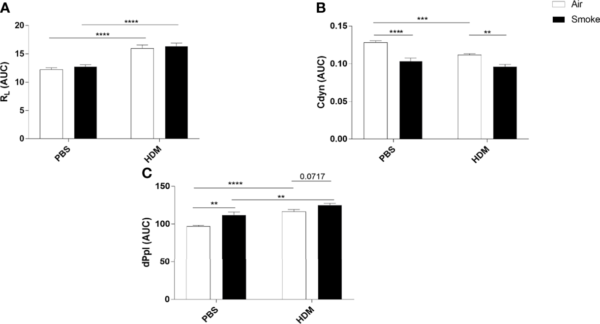 To have a better understanding of the lung elasticity properties, Cdyn (known as pulmonary dynamic compliance) was measured (Figure 2B). HDM treatment significantly reduced Cdyn values in offspring born to air-exposed mothers. Prenatal and postnatal CS exposure induced a significant reduction in Cdyn values in PBS-treated offspring born to CS-exposed mothers compared to offspring from air-exposed mothers (Figure 2B). We did not observe any additional effect of HDM treatment on Cdyn values in offspring born to CS-exposed mothers compared to PBS-treated offspring born to CS-exposed mothers (Figure 2B).