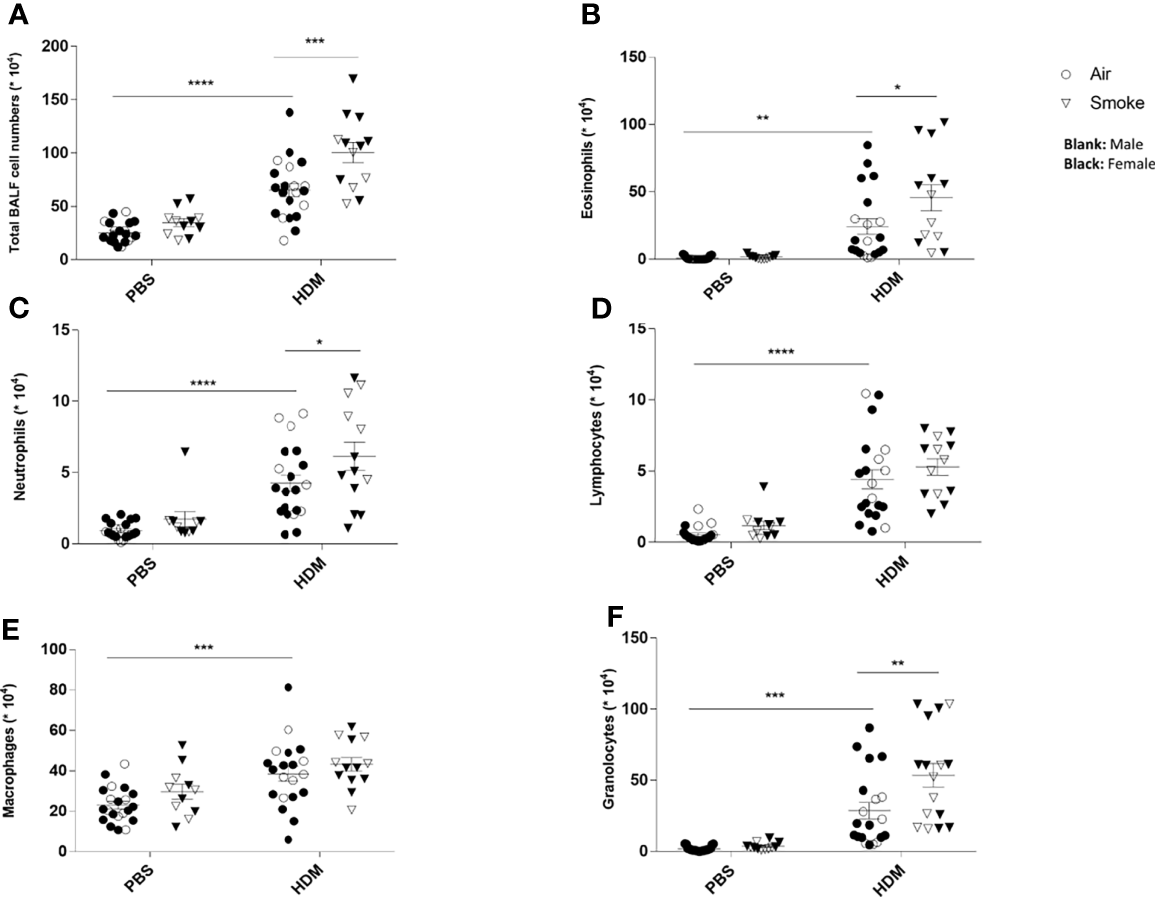 Prenatal and postnatal CS exposure induced additional inflammatory cell infiltration into the lungs of offspring upon HDM challenge. Prenatally and postnatally air- and CS-exposed offspring were intranasally (i.n.) sensitized with PBS or house dust mite (HDM) on day 37 and challenged on days 43-47 intranasally with PBS or HDM and sacrificed one day after last HDM/PBS challenge. Lungs were lavaged and BALF was collected for total (A) and differential BAL cell counts, including eosinophils (B), neutrophils (C), lymphocytes (D), macrophages (E) and granulocytes (F). *P < 0.05, **P < 0.01, ***P < 0.001 and ****P < 0.0001; as analyzed with two-way ANOVA followed by Bonferroni’s multiple comparisons test.