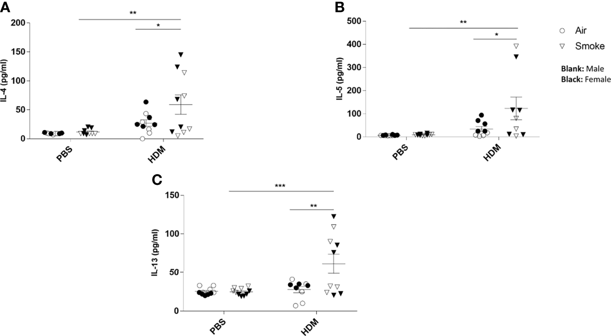 Another explanation might be found in the elevated levels of Th2-associated cytokines in the lungs, especially IL-13. Furthermore, excessive Th2 responses can lead to a robust fibroproliferative reactions in the lung, which consequently leads to less elasticity (96). We found that HDM treatment of offspring born to CS-exposed mothers leads to a significant increase in the IL-13 release into the BALF and ex-vivo restimulated lung tissue homogenates. Previous studies indicated that overexpression of IL-13, as a Th2 type cytokine, induces inflammation and airway remodeling (97, 98). Moreover, in an ex vivo model, IL-13 treatment in fibroblasts isolated from bronchial biopsies in patients with mild asthma and normal controls resulted in significant increase in collagen type-1 production, which consequently leads to reduced lung elasticity (99). Th2 type cytokines have also been linked to altered surfactant secretion in the lung, consequently leading to reduced dynamic lung compliance. For instance, IL-13 treatment significantly reduced mRNA and protein level of surfactant protein D (SP-D) in adult human alveolar type II cells in vitro (100). Previous studies have highlighted the role of sex differences in adaptive immune responses. For instance, women exhibit more activated CD4+ T cells and CD8+ T cells compared to men in an in vitro stimulation model of PBMCs with phytohaemagglutinin (101). Moreover, in vitro polyclonal activation of human PBMCs with mitogen phytohemagglutinin caused higher IL-4 and IL-10 cytokine production in female PMBCs than in male PBMCs (102). In the current study, our data also indicated gender-specific differences in HDM-induced immune responses in the offspring, where female offspring born to CS-exposed mothers exhibit higher immune responses than male offspring from CS-exposed mothers. This finding is in agreement with previous data of Fuseini et al., who found that intranasal administration of HDM to female BALB/c mice lead to higher BALF and lung IL-5, IL-13 and IL-17A protein expression compared to HDM-challenged male mice (103).
