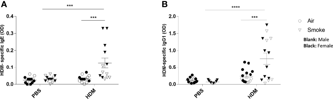 Prenatal and postnatal CS exposure followed increased the HDM-specific IgE and IgG1 release in serum from offspring upon HDM challenge. Prenatally and postnatally air- and CS-exposed offspring were intranasally (i.n.) sensitized with PBS or house dust mite (HDM) on day 37 and challenged on days 43-47 intranasally with PBS or HDM and sacrificed one day after last HDM/PBS challenge. HDM-IgE (A) and HDM-IgG1 (B) were measured in serum by means of ELISA. Results are shown as mean ± SEM. Statistical significance of differences was tested using a One-Way ANOVA with post hoc Bonferroni’s multiple comparisons test. ***P < 0.001 and ****P < 0.0001; as analyzed with two-way ANOVA followed by Bonferroni’s multiple comparisons test.